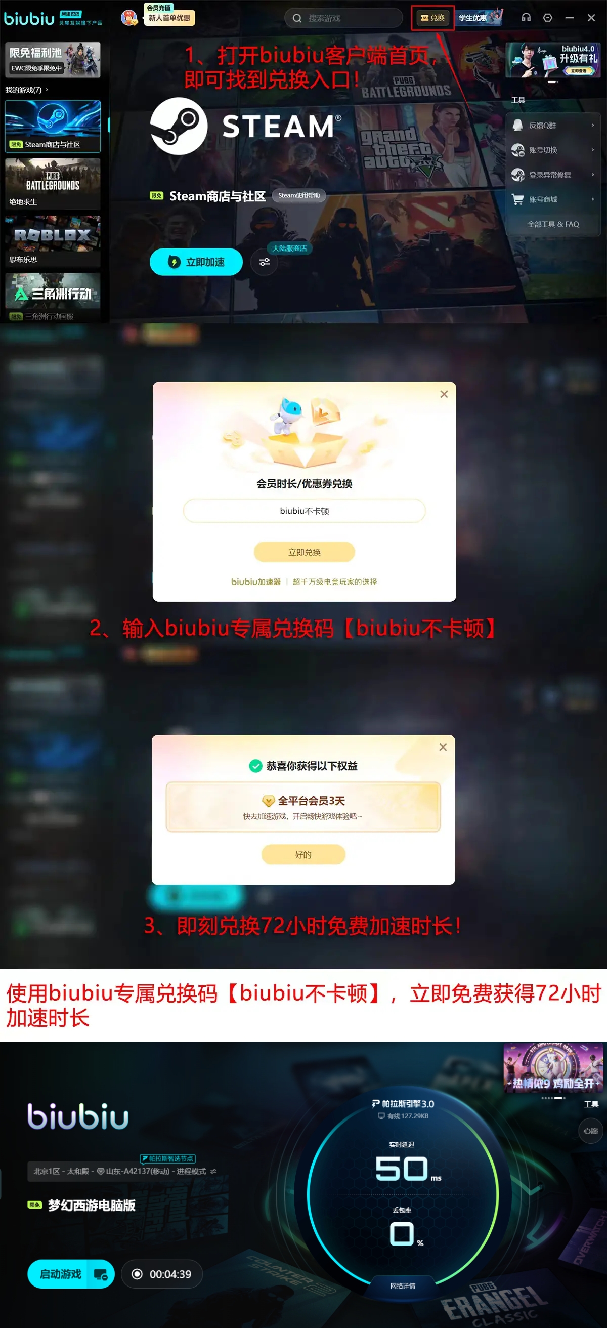 为便于用户直观评估效果,建议通过新建测试账号方式快速验证加速能力。新用户注册即赠24小时全游戏通用加速时长;所有用户输入兑换码【biubiu不卡顿】可额外获得72小时加速权益。兑换入口位于biubiu客户端首页显眼位置,操作流程简洁,三步即可完成激活。
