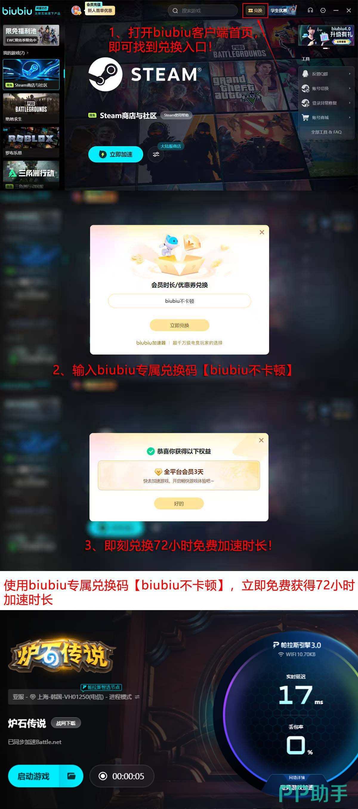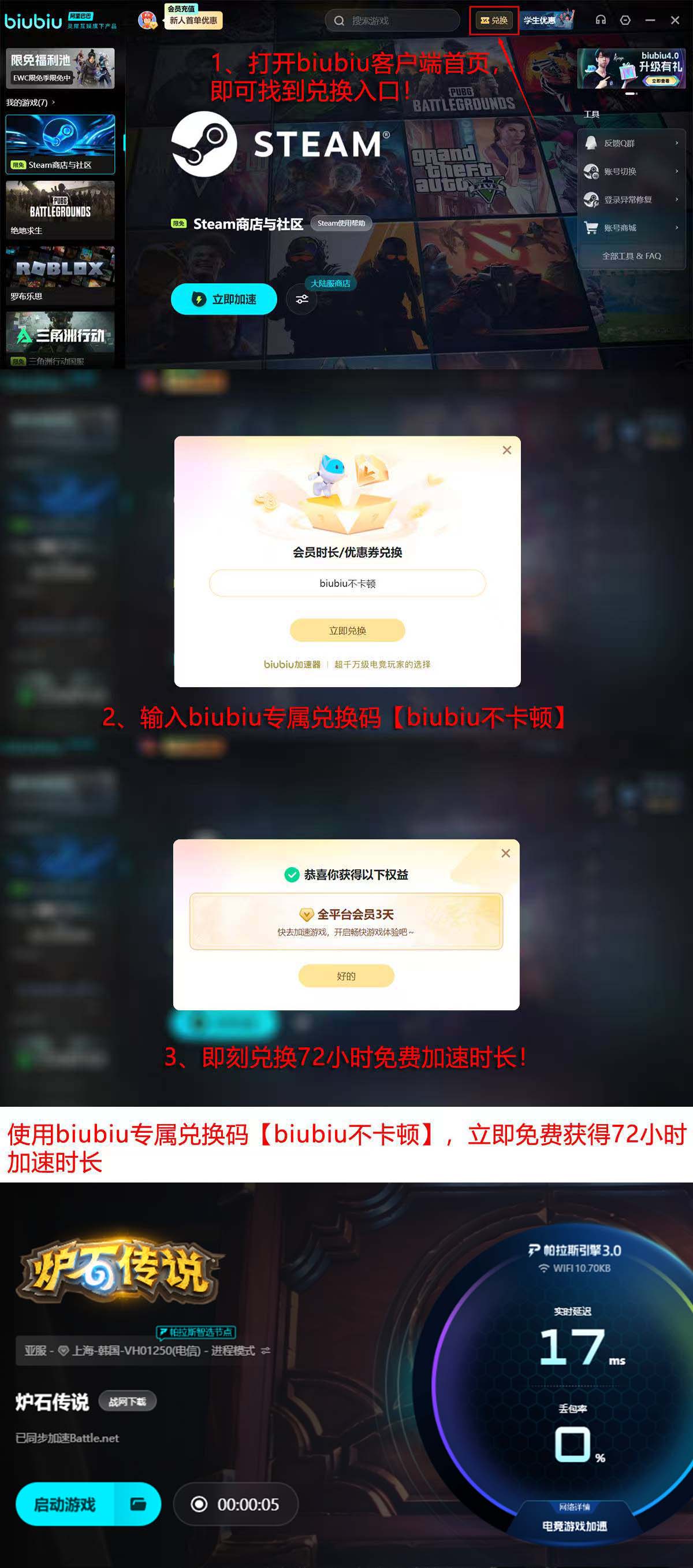 需要特别指出的是,《炉石传说》作为强实时对抗型卡牌竞技游戏,其网络负载远高于传统单机或轻度联网卡牌产品,对连接稳定性提出更高要求。若你正受闪退困扰,建议优先尝试biubiu加速器提供的免费体验服务:完成注册后系统自动发放24小时试用时长;随后前往首页兑换中心,输入口令【biubiu不卡顿】即可额外获得72小时,总计可享96小时全功能体验。