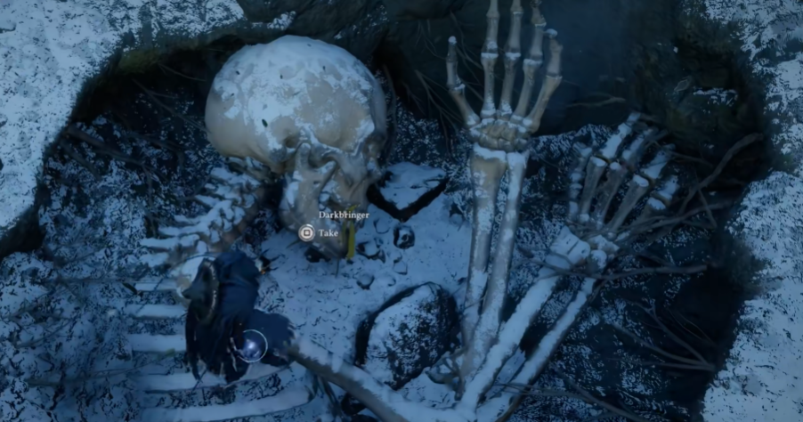 前往大地图最北端,银狼山以西偏左区域。此处可见一处深陷的岩坑,坑底横卧一具巨型骸骨。跳入坑内后,靠近骸骨头部,可发现其上颌齿列中插有一柄泛金光的单手剑。攀爬至骸骨左臂平台,调整视角至合适角度,待交互提示出现后即可拔出武器。