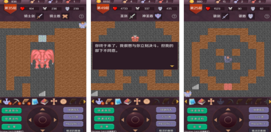 采用复古像素风格呈现,包含上古模式与简易模式双路径,共设50层独立关卡。玩家需从第一层出发,逐层向上推进,每层均配置专属Boss与敌人组合。战斗过程无自动判定,依赖玩家自主选择攻击、防御、使用道具等策略动作,强调资源管理与战术规划能力。