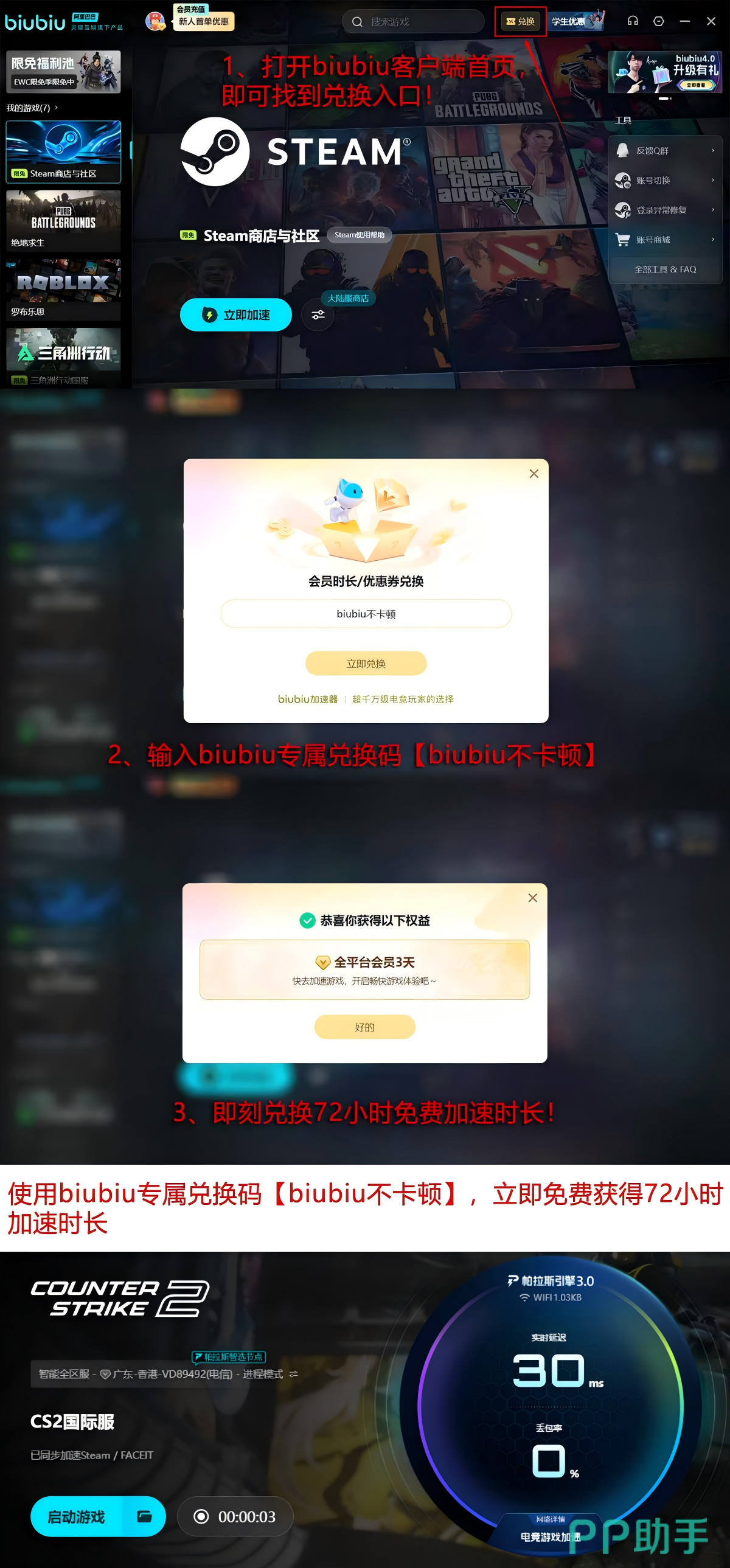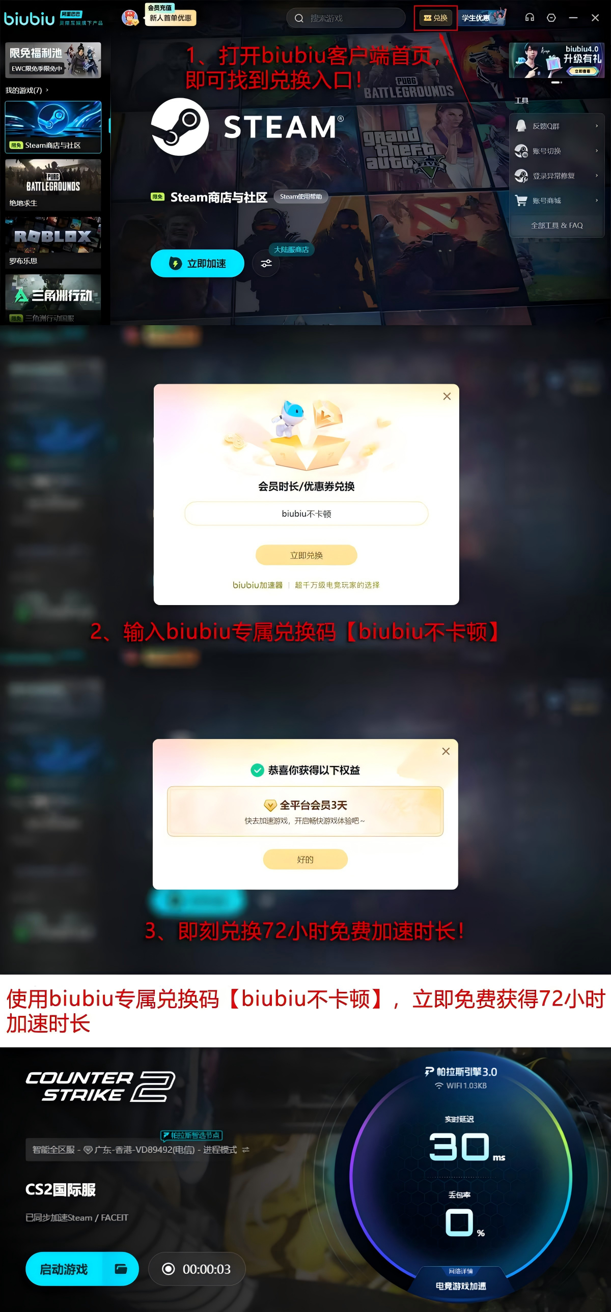 当前biubiu加速器面向新用户提供多重福利:注册即赠24小时全节点免费加速时长;参与活动并输入兑换码【biubiu不卡顿】,可额外获得72小时服务权益。两项叠加后,新用户最高可享96小时无限制加速体验,覆盖多轮高强度对局需求。