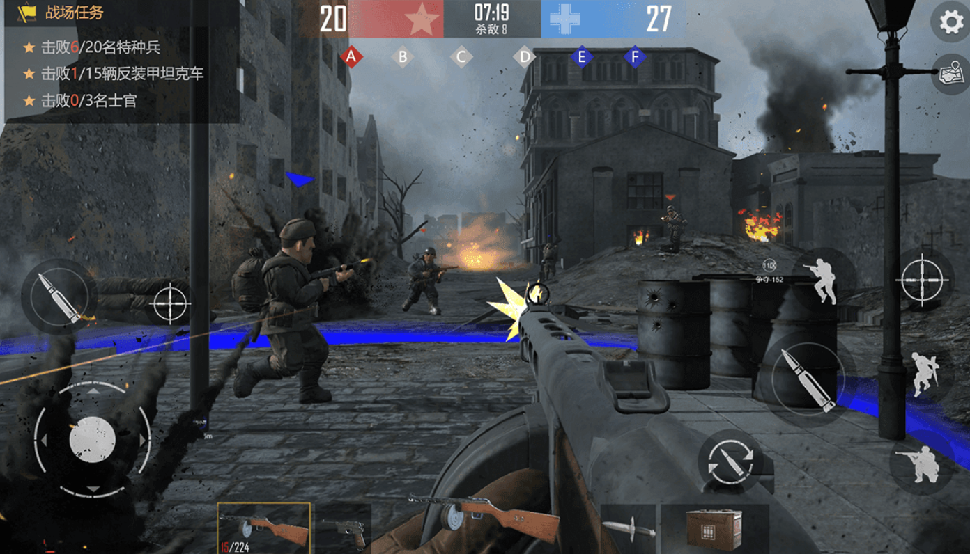 作为第一人称射击类二战手游,《一线二战之战》采用写实风格建模与动态光影系统,地图还原斯大林格勒巷战、阿登森林战役等关键战场。角色动作捕捉细腻,后坐力反馈与换弹节奏贴合真实枪械参数。玩家可自由编组作战单位,升级士兵技能树并定制装备配件,通过多周目战役逐步解锁M1911、PPSh-41、Kar98k等经典枪械及对应弹药属性。