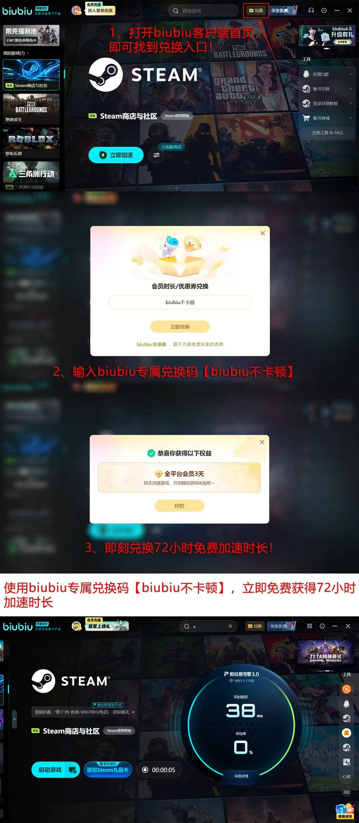 除核心加速能力外,biubiu加速器当前面向新用户提供多重激活权益:完成首次注册并登录后,系统自动发放24小时全功能加速时长;若在兑换栏输入专属码【biubiu不卡顿】,还可额外获得72小时加速权限,累计达96小时免费使用。老用户亦可通过相同方式领取限时加速福利;购买双年卡、年卡或季卡会员时,平台同步提供阶梯式价格优惠,切实降低长期使用成本。