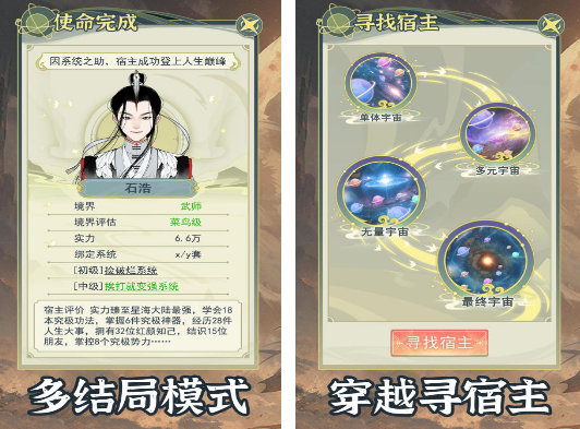 主打元叙事与沙盒模拟的创新品类手游。玩家并非直接扮演穿越者,而是作为“系统观测员”,为不同宿主匹配适配能力模板(如科技侧、武道侧、言灵侧等),并设定初始参数。通过实时推演、干预关键事件、调整因果权重等方式引导宿主成长路径。每个宿主拥有完整人生阶段模型,涵盖幼年启蒙、青年历练、中年抉择、晚年归宿四大模块,支持多周目存档对比与结局图谱可视化分析。