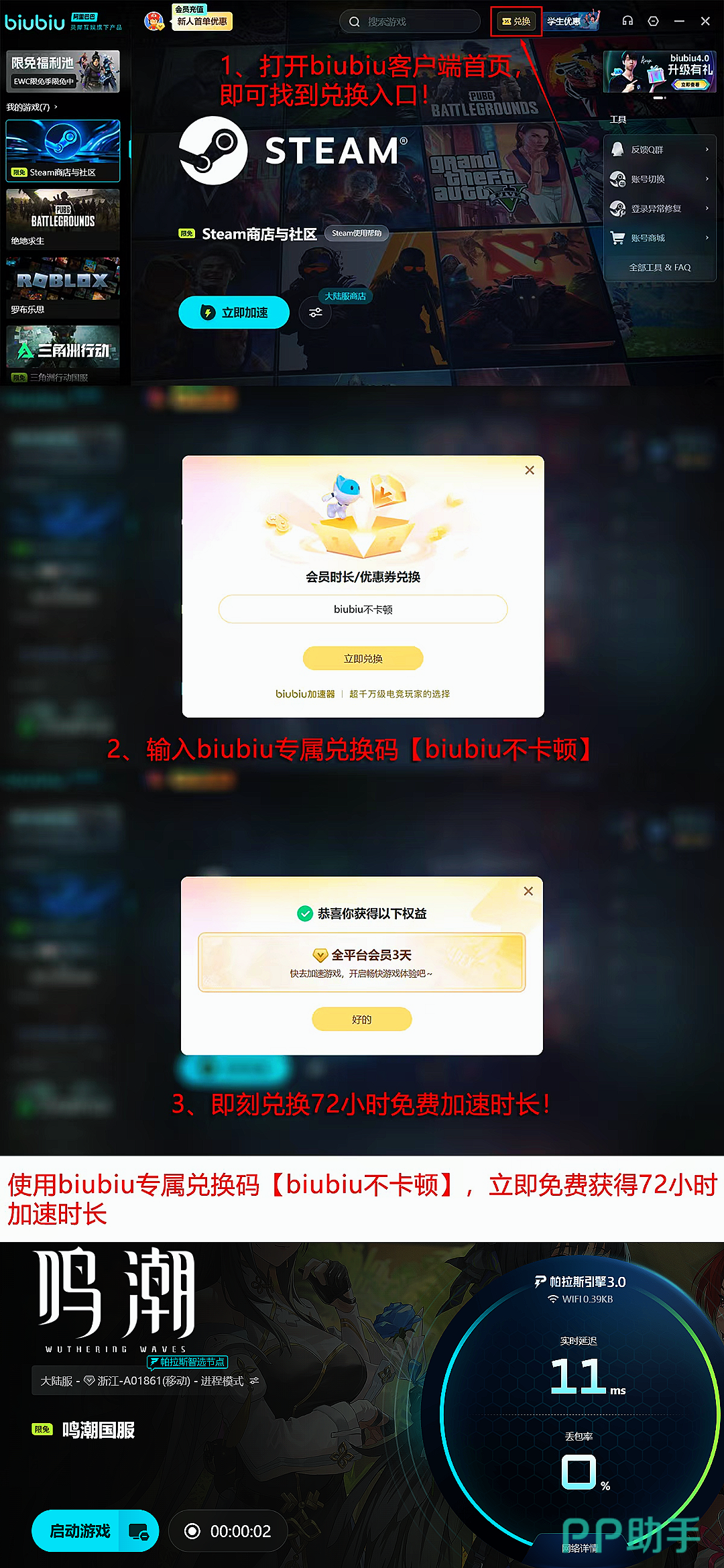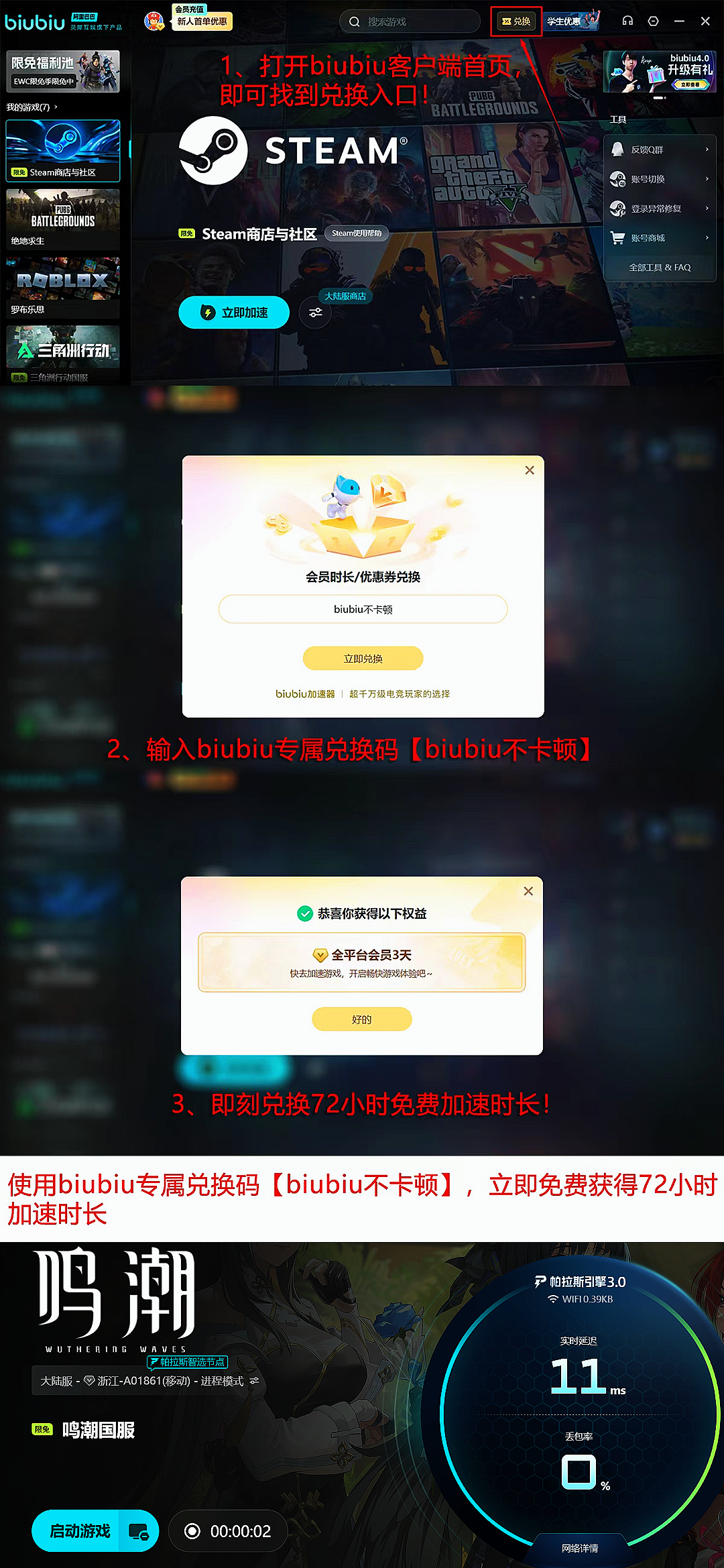 新用户注册即享24小时全游戏不限速加速权益;另可在兑换中心输入激活码【biubiu不卡顿】,额外领取3天免费加速时长,无门槛即时生效。