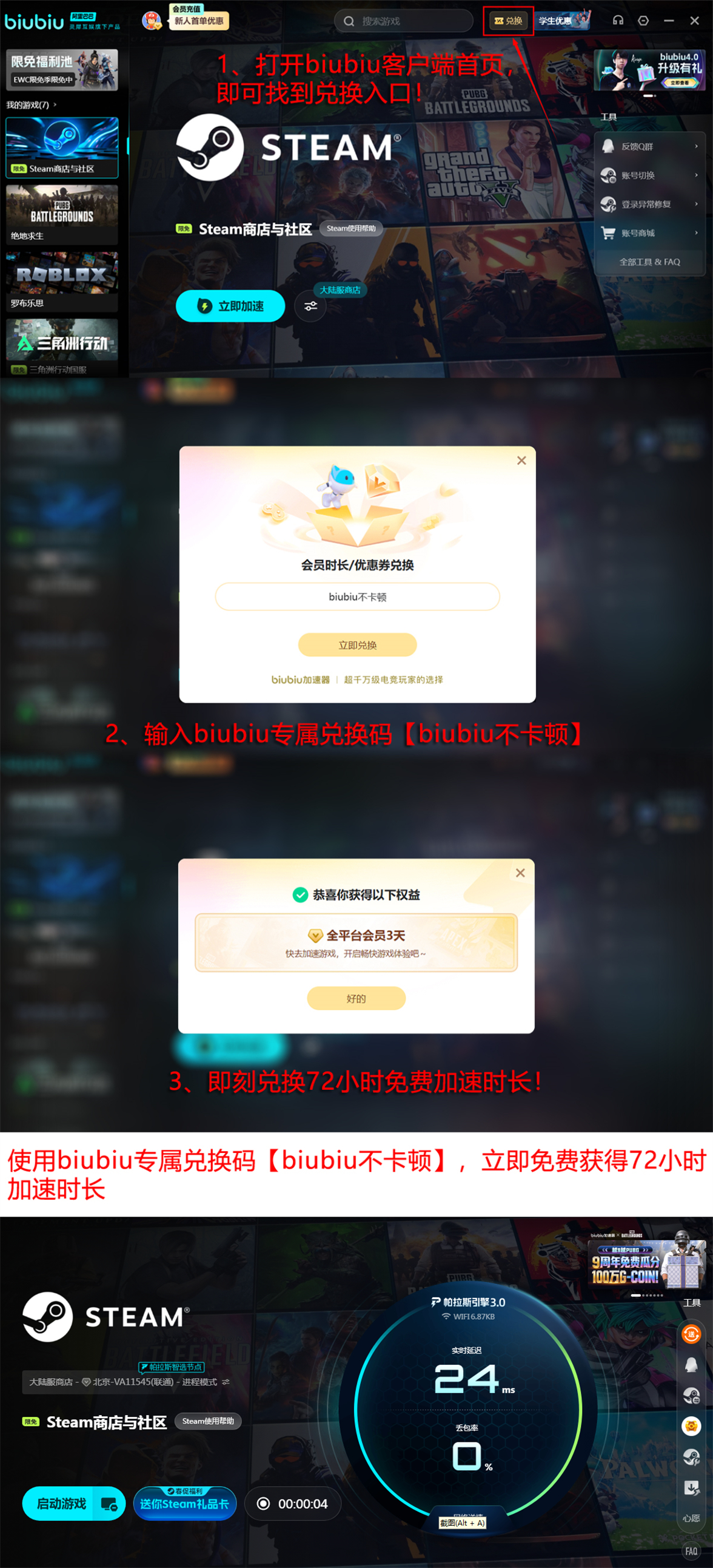 新用户可通过注册账号即刻启用免费试用服务:首次注册账户可获得连续24小时无限制加速权限。另附专属兑换码【biubiu不卡顿】,每个账号限用一次,成功激活后额外赠送72小时加速时长。两项权益叠加,总计享有96小时深度体验周期,足以完成主线全流程测试及多存档压力验证。后续订阅支持月付、季付、年付等多种周期选项,其中长期套餐按日均成本计费更具性价比,适合持续投入该系列作品的玩家群体。