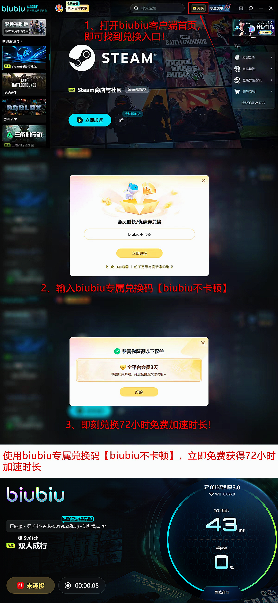 目前新注册用户可即刻开通24小时全游戏免费加速权限,不限带宽、不设时长上限,适用于《双人成行》及其他EA平台全系作品;所有账户登录后进入兑换中心,输入口令【biubiu不卡顿】,还可额外激活3天高级加速服务权益,全程保障低延迟、零抖动的联机体验。