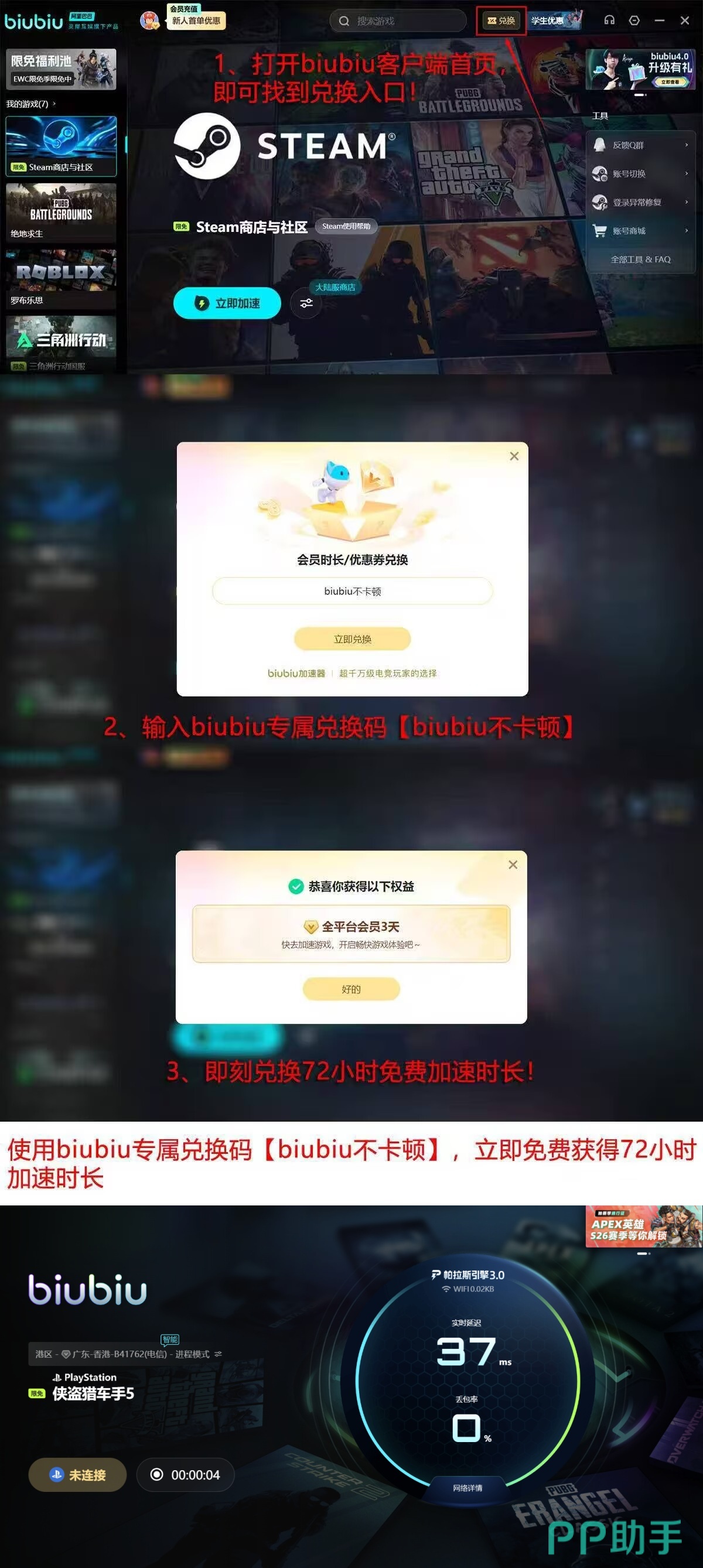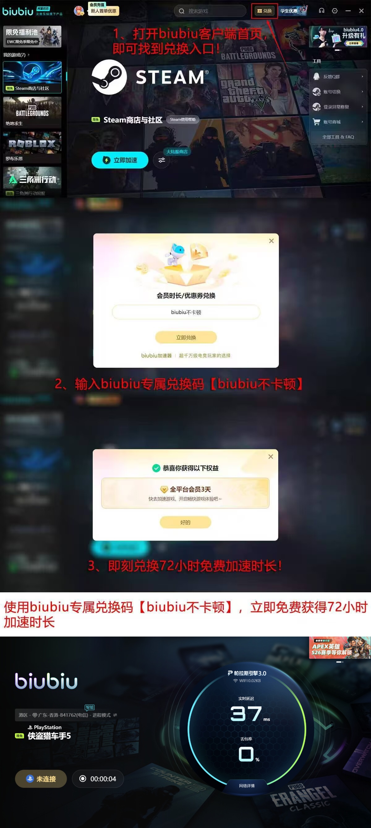 为降低用户使用门槛,biubiu加速器当前开放限时体验权益:新注册用户可直接领取24小时全功能免费加速时长;老用户通过活动入口输入口令【biubiu不卡顿】,还可额外获赠3天高级服务权限;两项权益叠加最高可达96小时连续加速体验,显著减少试用成本,也反映出产品对自身技术稳定性的充分信心。