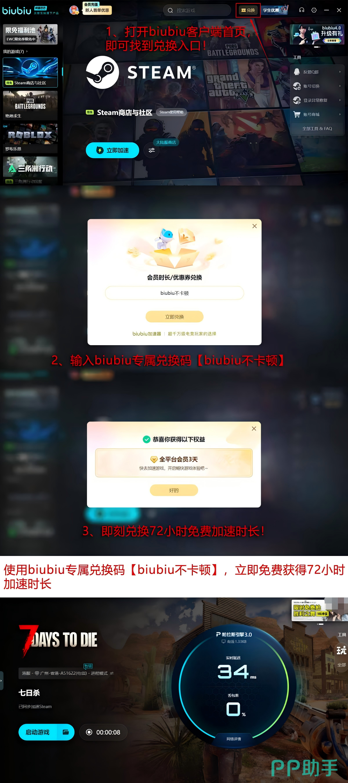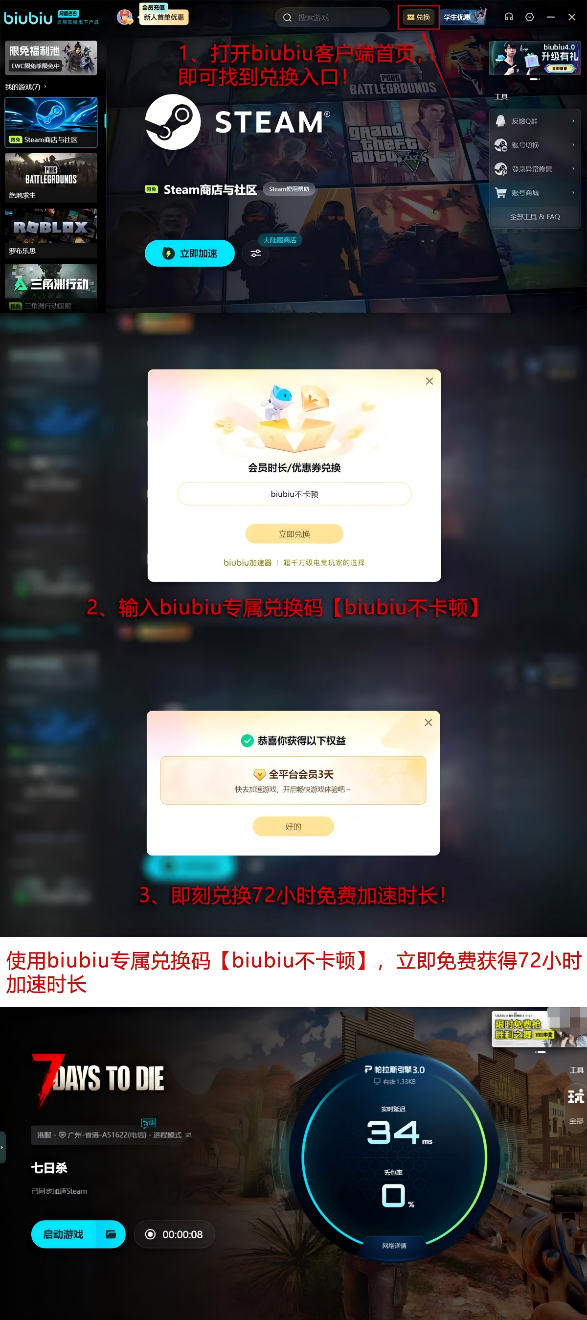 新用户注册后即可获得24小时全功能加速服务权限。如需延长使用时长,可在客户端首页右上角进入兑换入口,输入口令【biubiu不卡顿】,额外领取72小时加速时长。两项权益叠加后,首次使用的玩家可连续享受总计96小时的免费加速服务,充分覆盖多轮联机探索与协作生存周期。