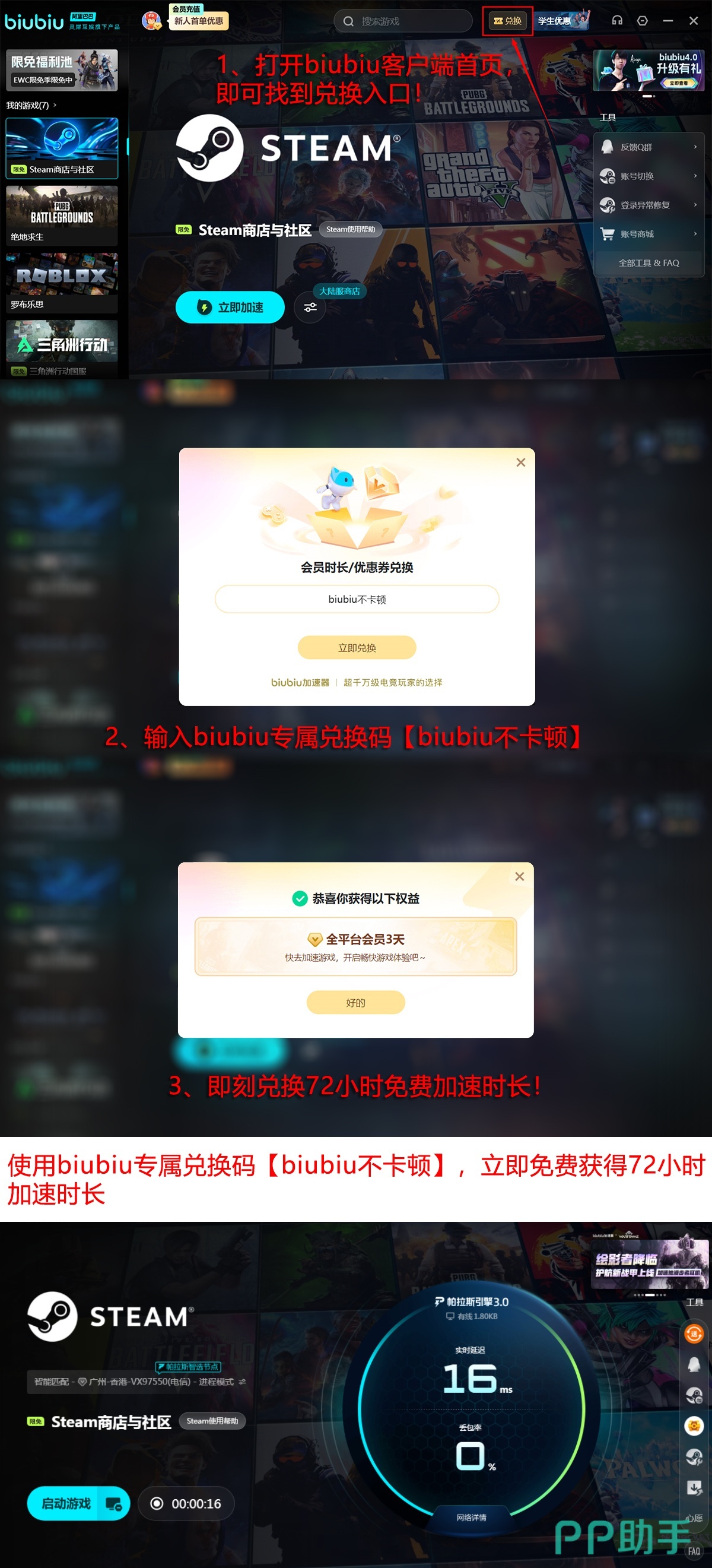 当前biubiu推出多项新人激励政策:新注册用户可享24小时全功能免费试用,零门槛体验加速效果;另面向全体用户开放限时福利——输入专属码【biubiu不卡顿】即可领取连续三天高级加速服务,全程无订阅绑定、无隐藏扣费,切实降低试错成本。