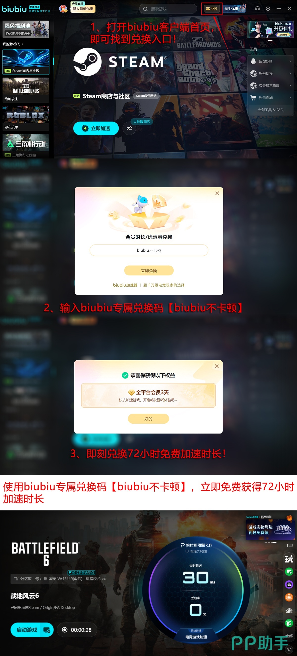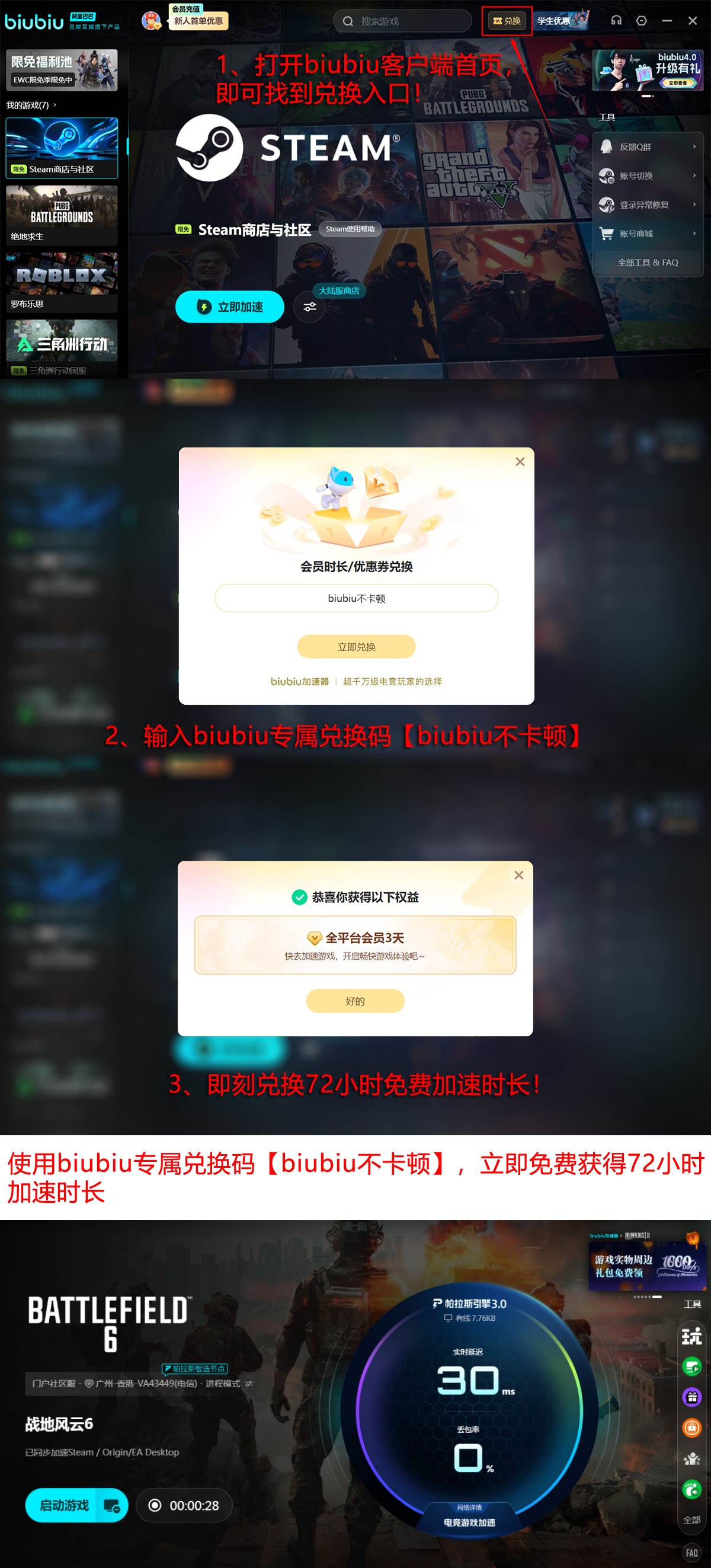 biubiu加速器采用零门槛试用机制,新注册用户可即时获取24小时全游戏免费加速权益;当前所有账号还可凭兑换码【biubiu不卡顿】额外领取3天高级加速服务。全程无强制订阅、无隐藏扣费、无捆绑软件,支持一键识别《战地6》并自动启用最优加速策略,即使中低配PC亦能获得稳定流畅的载具驾驶与实时交火体验。