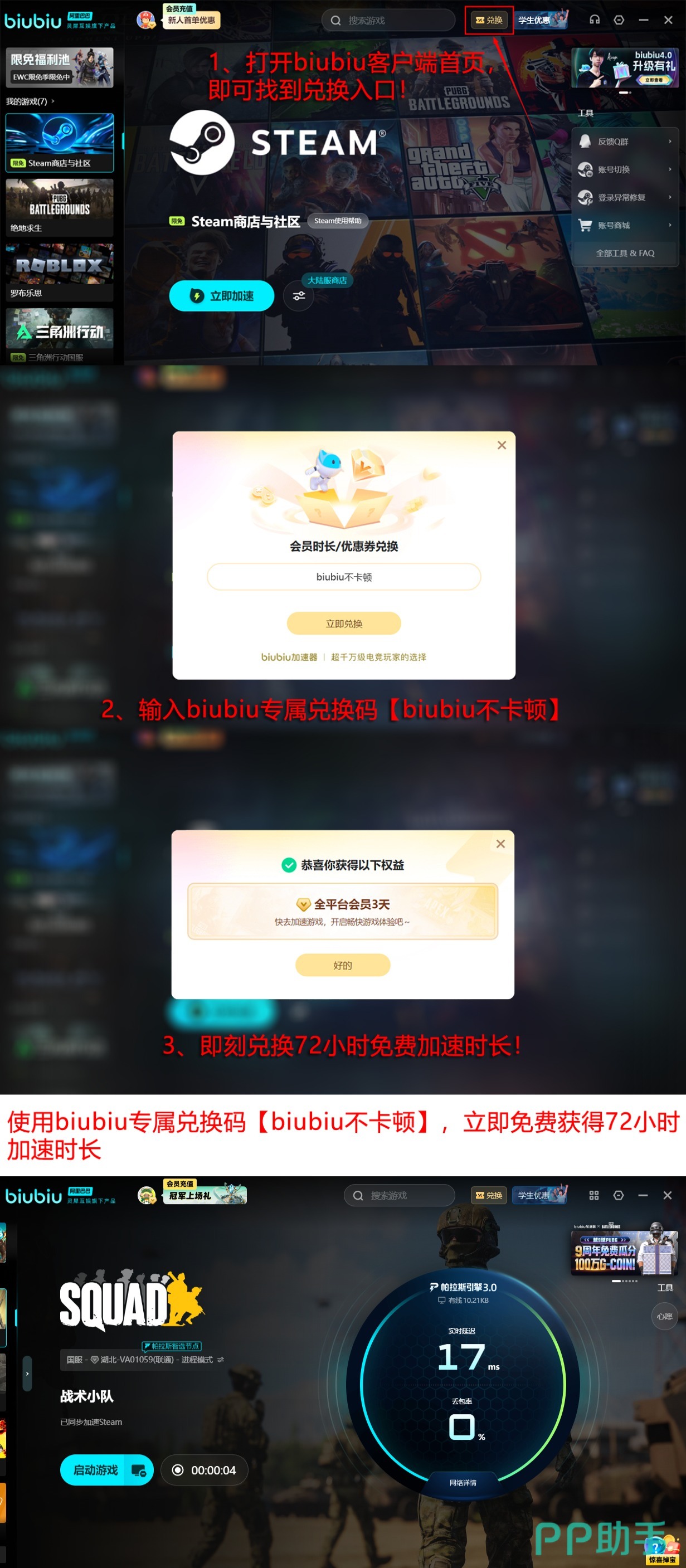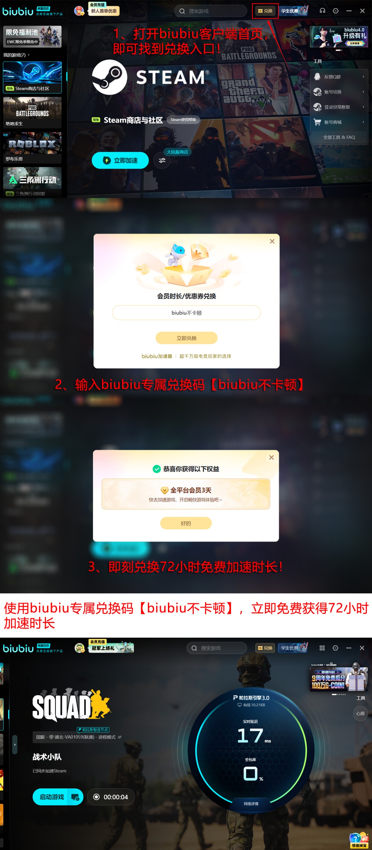 目前正值biubiu加速器功能升级后的推广期。新用户完成注册并首次登录,即可即时激活24小时VIP权限,畅享全平台游戏加速服务。存量用户亦可参与限时活动,统一输入兑换口令【biubiu不卡顿】,免费领取72小时VIP加速时长,覆盖全部高速节点与优化线路。