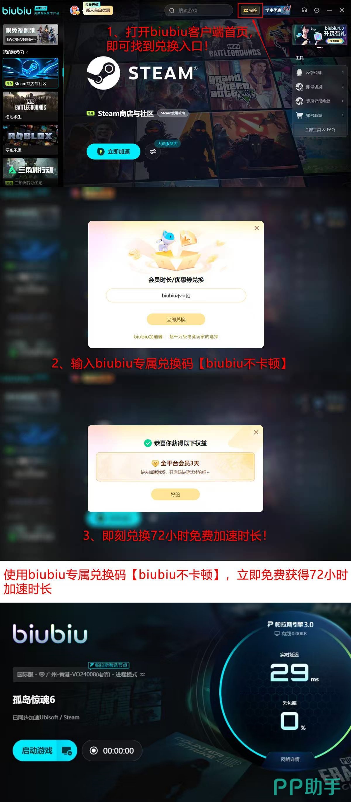 除技术实力外,biubiu加速器亦提供面向新用户的友好体验政策:注册即赠24小时全游戏通用免费加速时长;登录后前往首页“兑换中心”,输入专属口令【biubiu不卡顿】,可额外领取3天连续使用权。两项权益可叠加使用,总计达96小时零门槛试用周期,足以支撑完整主线流程、三大区域解放任务及多人协同作战体验。