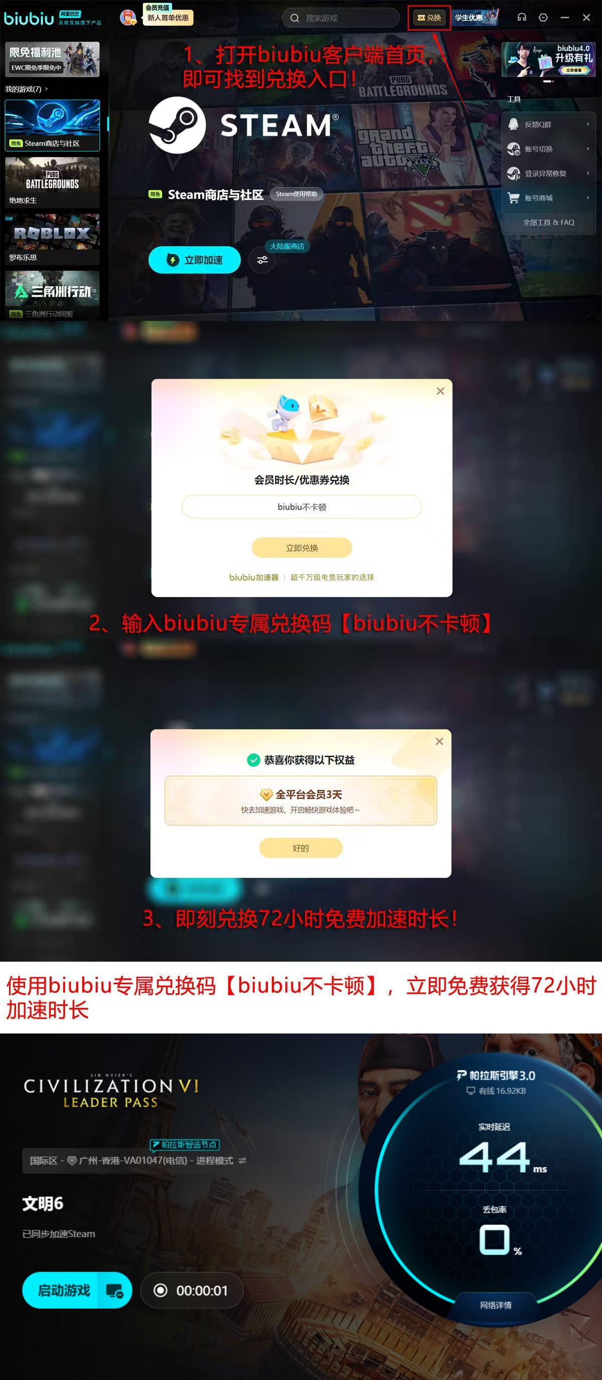 新用户注册后即可激活24小时全功能免费试用权限,无需绑定支付方式。若需延长体验周期,可输入兑换码【biubiu不卡顿】额外获得72小时加速时长,充分验证实际优化效果后再决定是否开通正式服务。