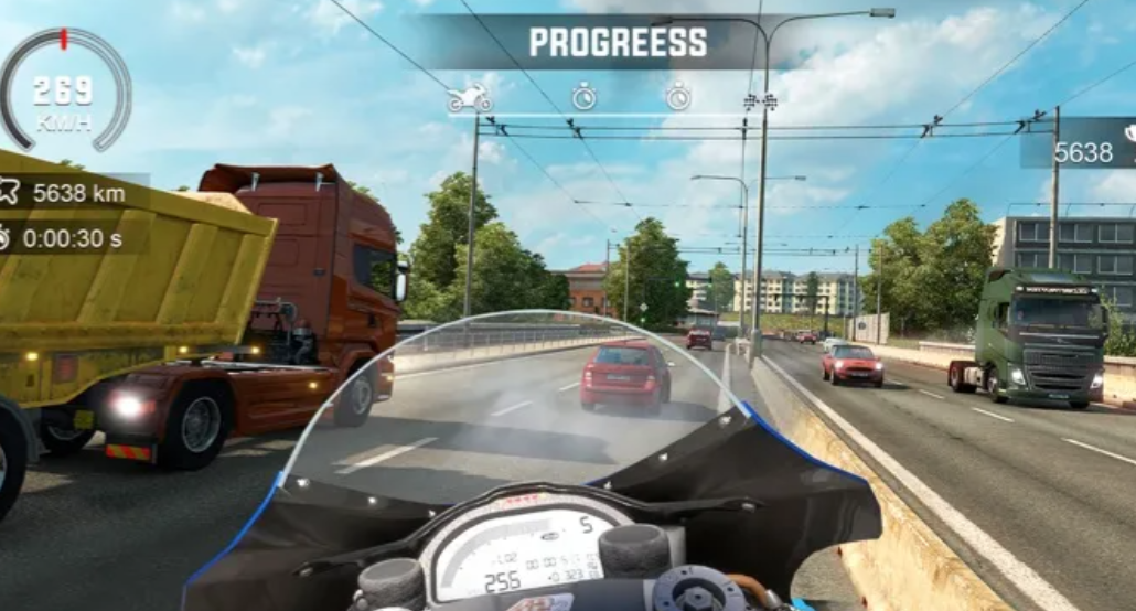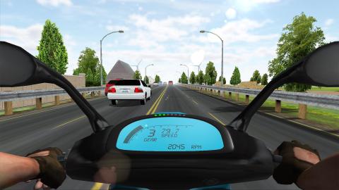 本作采用第一人称主视角设计,完整呈现仪表盘读数、手把转向反馈、前挡风玻璃视野及道路纵深关系,大幅增强骑行代入感。构建开放式公路沙盒环境,要求玩家遵守基础交规,在密集车流中完成变道、超车、避让等操作,还原真实通勤与长途骑行节奏。集成动态天气系统,晴、雨、雾三种模式分别影响能见度阈值、路面附着系数及制动响应延迟,考验综合路况判断能力。车辆库涵盖多款经典街车型号,支持动力输出映射、制动比调节等基础性能优化选项。