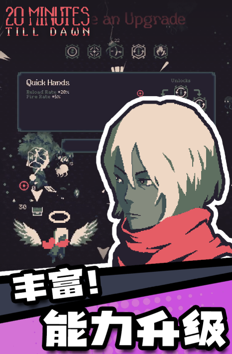 核心玩法围绕“20分钟生存倒计时”展开,需抵御多波次递进式怪物潮。局外成长采用永久性符文系统,资源积累直接转化为角色基础属性与被动技能强化。初始开放7名可操作角色,武器库持续扩展,角色与武器组合决定流派底层逻辑,不同搭配产生显著差异化的打击反馈与清屏效率。