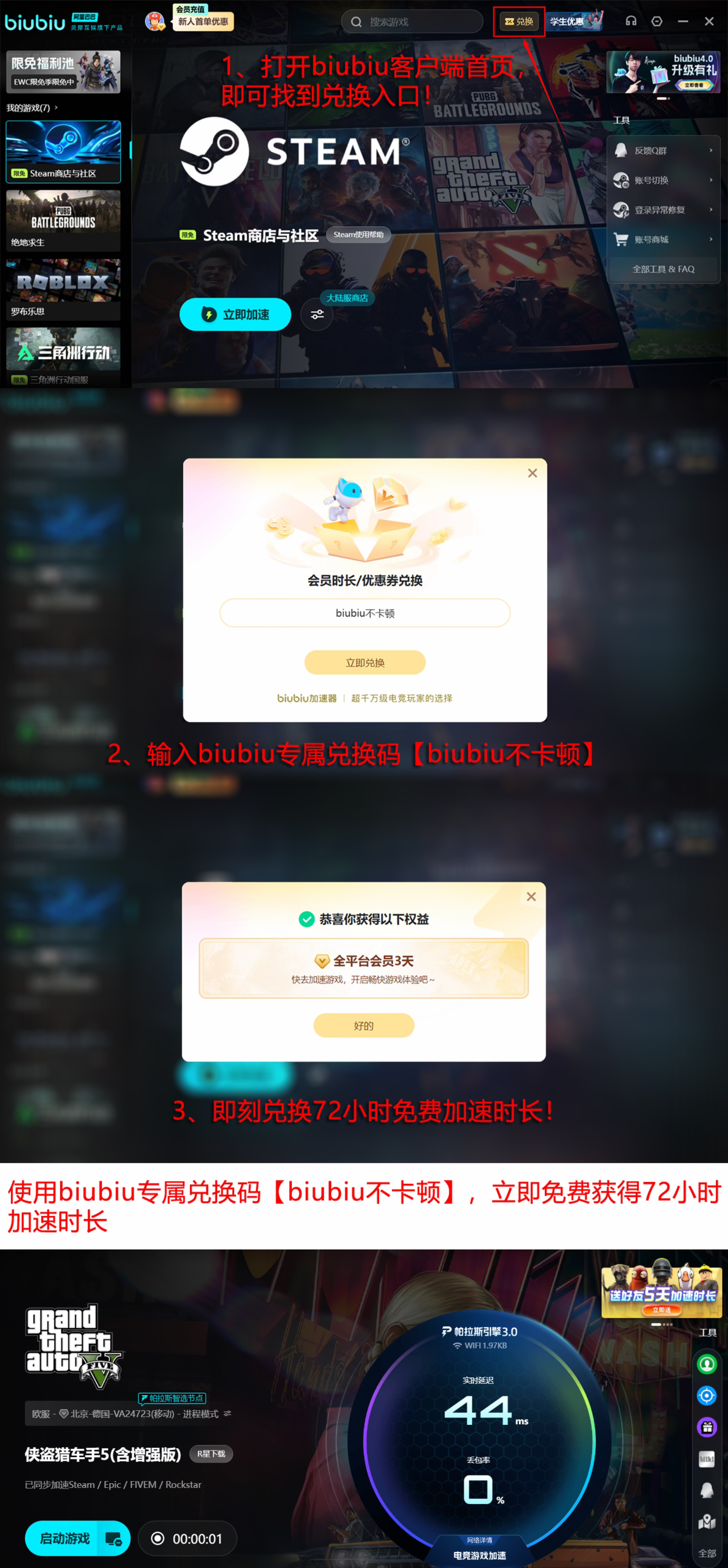 新用户完成注册并登录后,可立即获赠24小时VIP加速权限,覆盖游戏库内全部支持标题,包括《GTA5》全平台版本。所有用户均可通过口令【biubiu不卡顿】免费领取3天高级加速服务,期间启用帧率锁定、纹理压缩与垂直同步优化等进阶设置,显著缓解GPU瞬时负载压力,从根源减少载入阶段闪退概率。