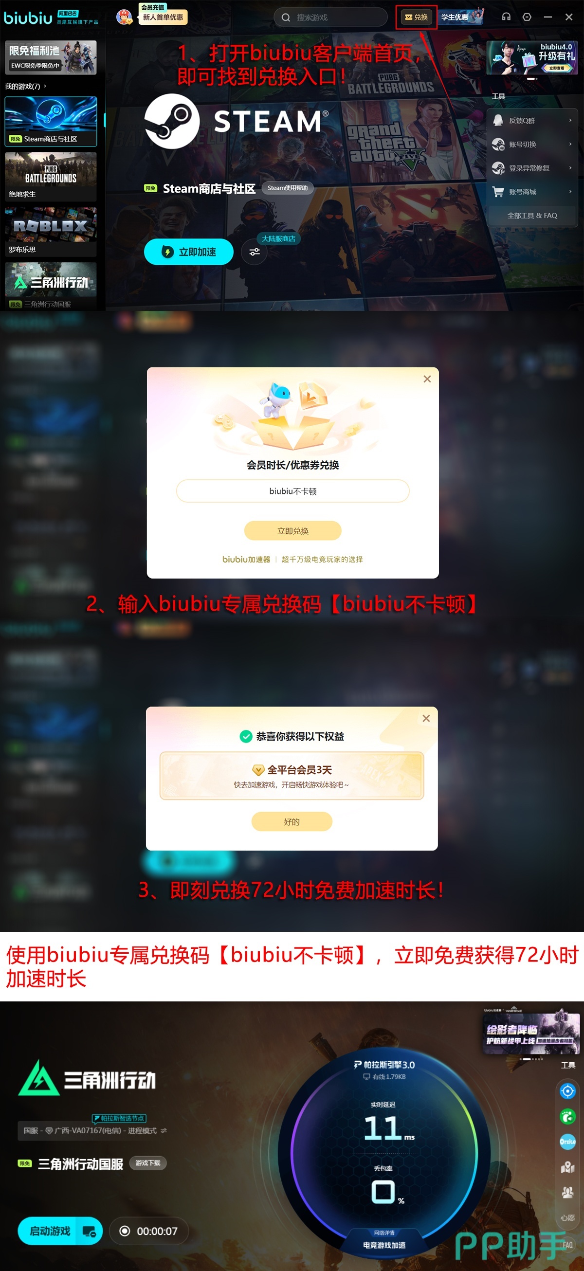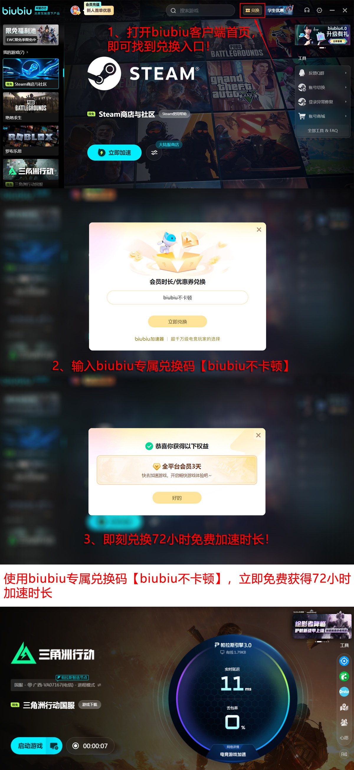 biubiu加速器资源占用率低,兼容主流Windows系统,新用户注册即可获赠24小时全功能免费试用权限,全程无广告干扰、无弹窗打断。输入兑换码【biubiu不卡顿】还可额外领取3天连续加速服务,适用于新老用户。