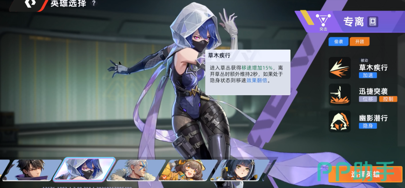 专离的角色设定融合了敏捷身法与战术柔韧感,在战场表现上兼具视觉张力与操作深度。其技能体系围绕“突袭—隐匿—控场”三重逻辑构建,三个主动/被动技能存在明确联动关系。被动技能【草木疾行】生效后,角色进入草丛将获得移速加成;脱离草丛后效果仍可持续2秒;若在此期间开启隐身状态,移速增益将提升至基础值的2倍。这一机制显著强化了地图转点、快速支援及绕后切入效率。