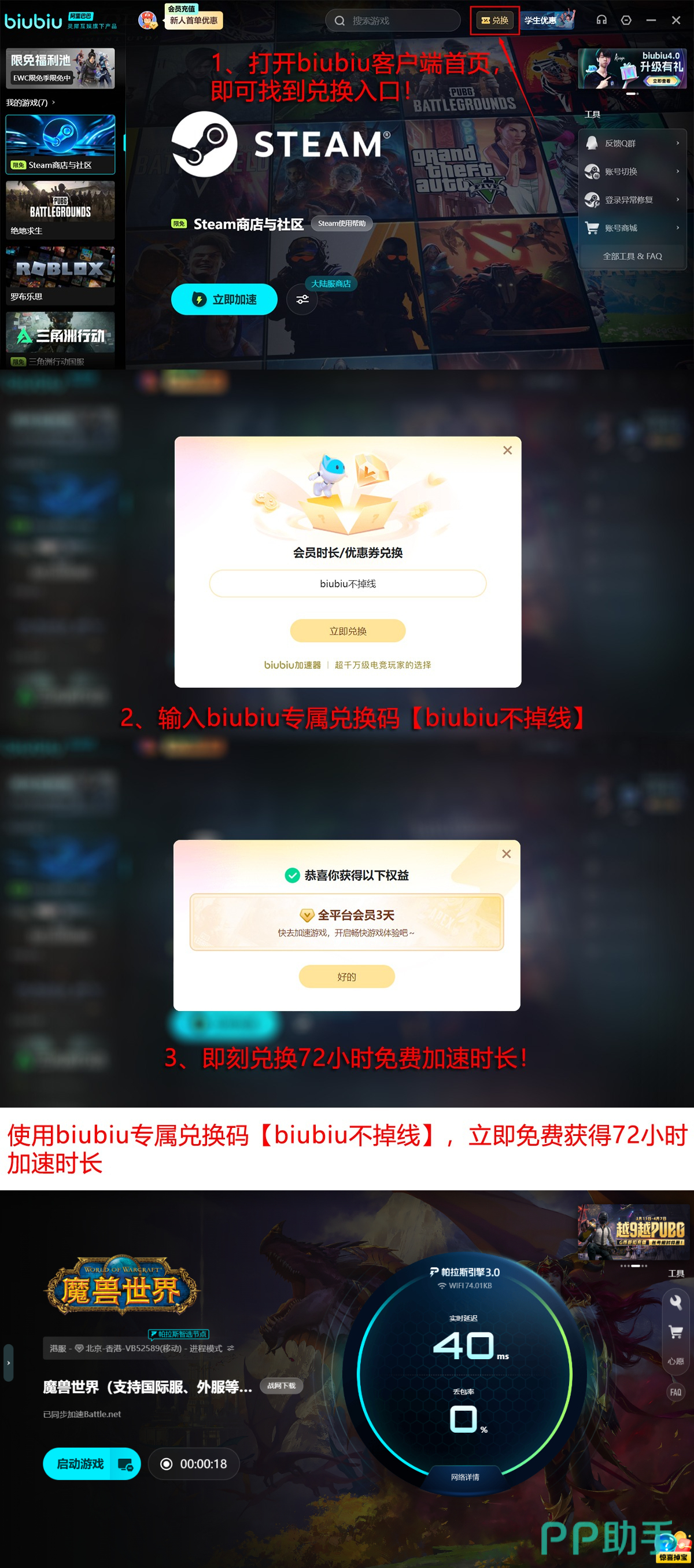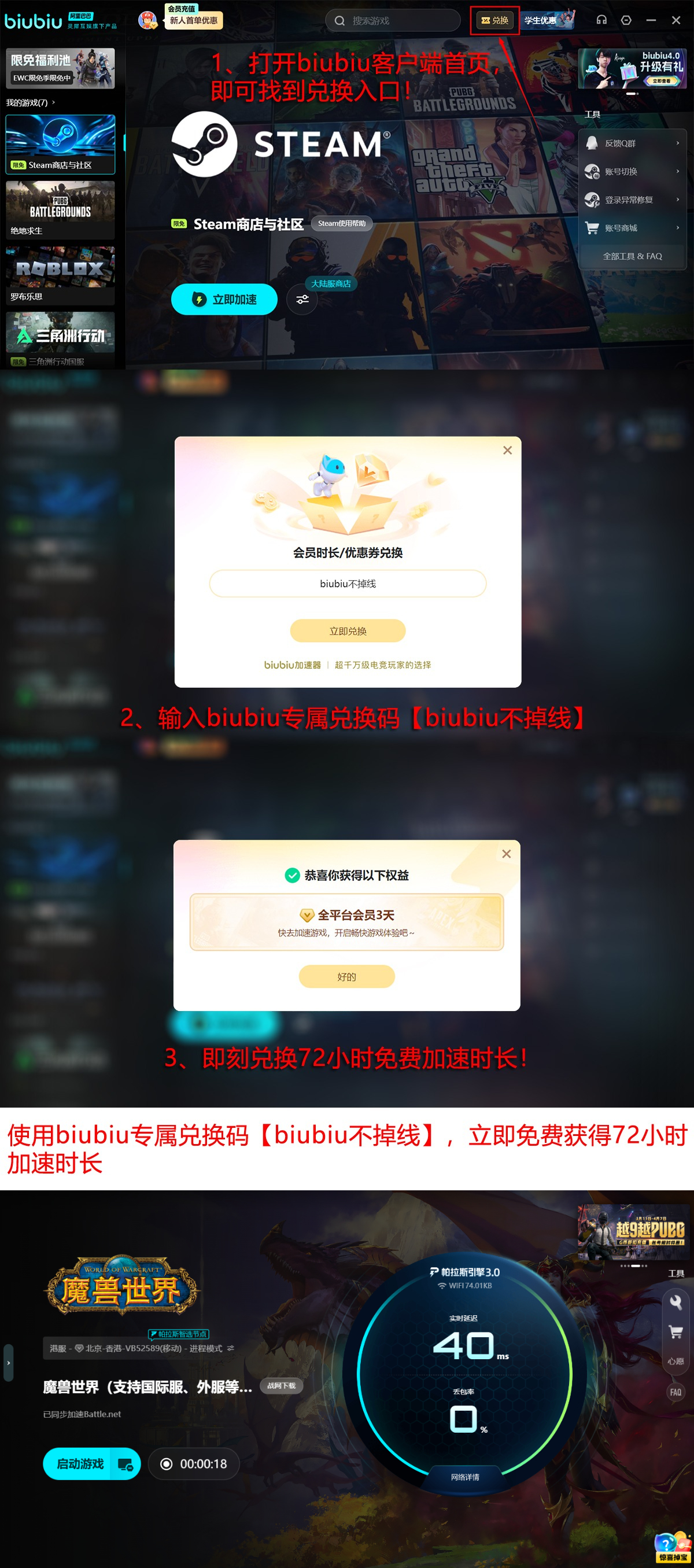 新用户注册即可获得全功能免费体验资格,总计时长为96小时:其中首段24小时为系统自动开通;完成指定动作后输入激活码【biubiu不掉线】,还可额外领取72小时加速权益。全程无需绑定支付方式,零门槛验证biubiu加速器在《魔兽世界》中的实际优化效果,切实感受无卡顿、无断连、无技能延迟的纯净冒险节奏。