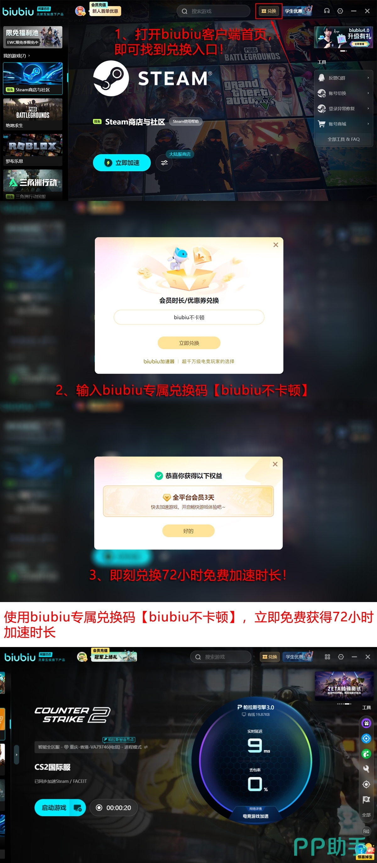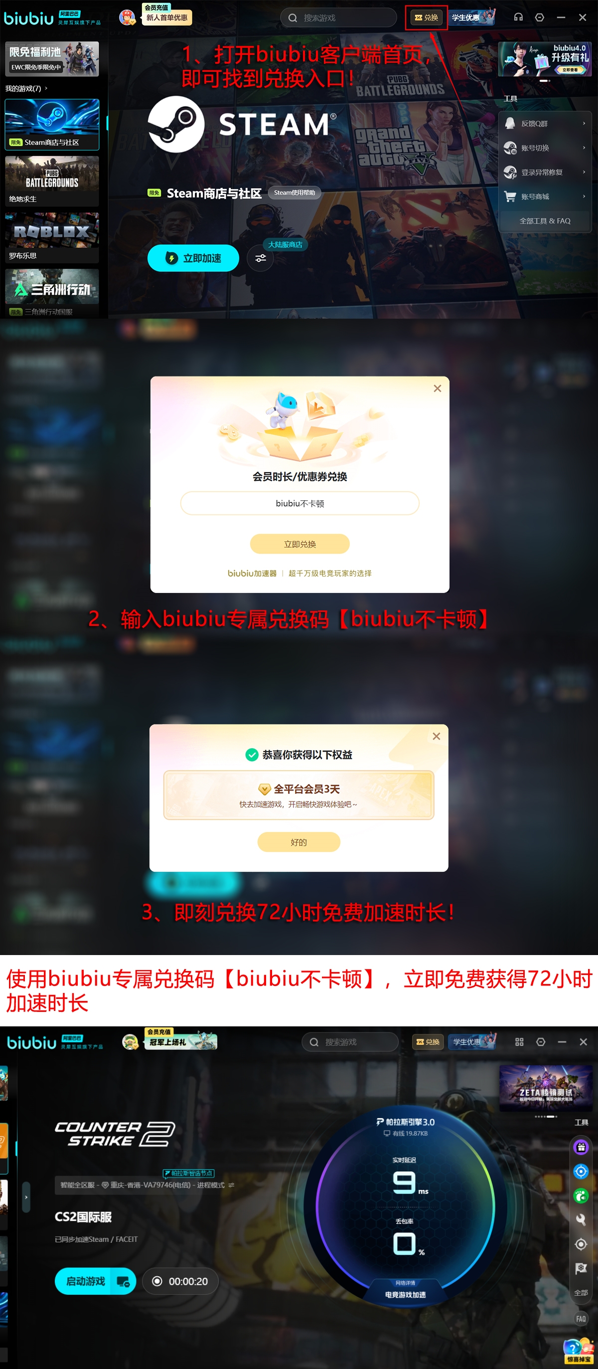 针对用户普遍关注的付费门槛问题,biubiu加速器现推出限时福利活动:新注册用户完成首次登录,即可自动获得24小时免费加速时长;新老用户输入兑换码【biubiu不卡顿】,可在客户端内一次性领取72小时免费加速权限。两项权益可叠加使用,新用户最高可累计享有96小时无限制加速服务,无需订阅会员即可享受稳定低延迟体验。