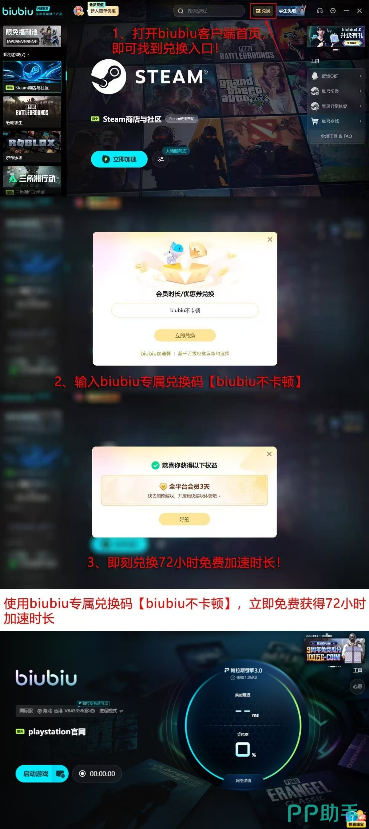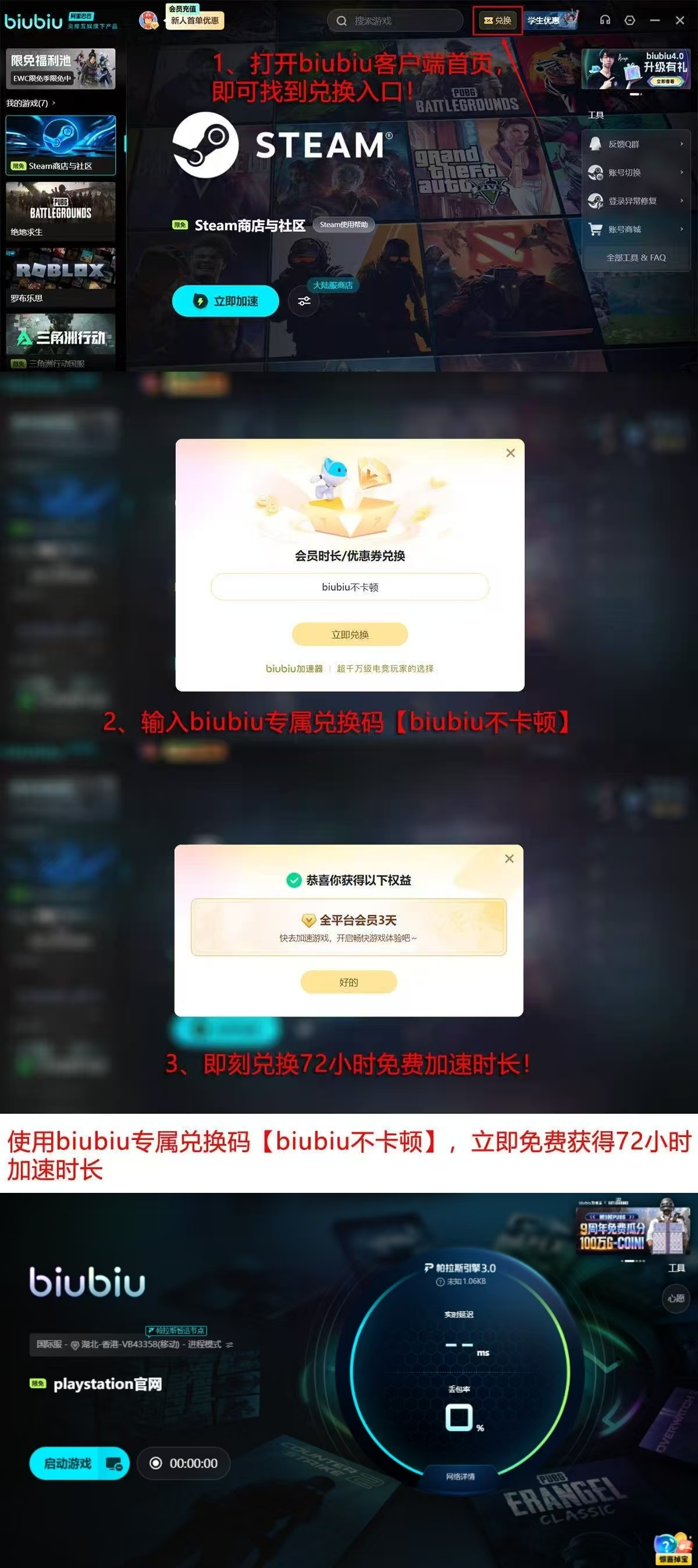 新用户完成注册即可领取24小时全功能免费试用权限;前往活动页面输入口令【biubiu不卡顿】,还可额外获赠72小时加速时长,总计享有96小时无限制体验。