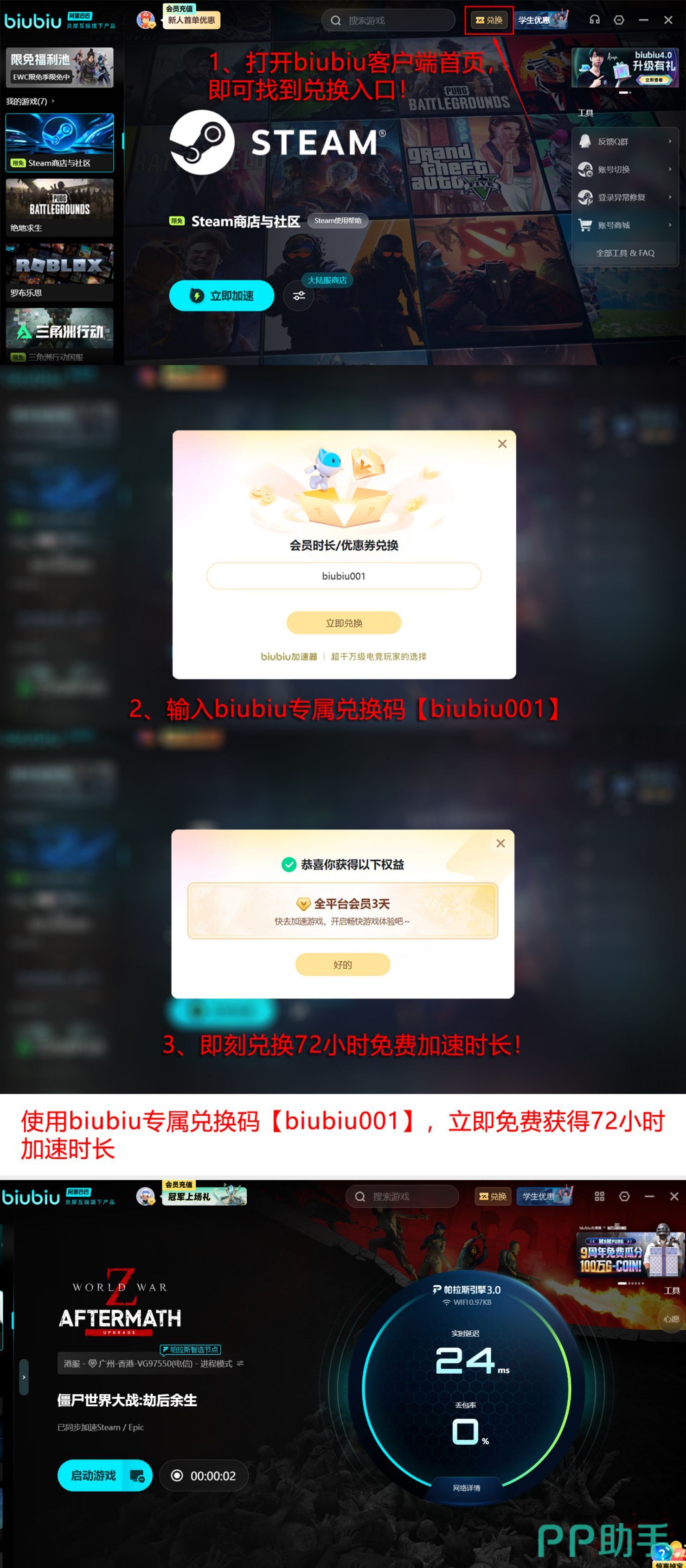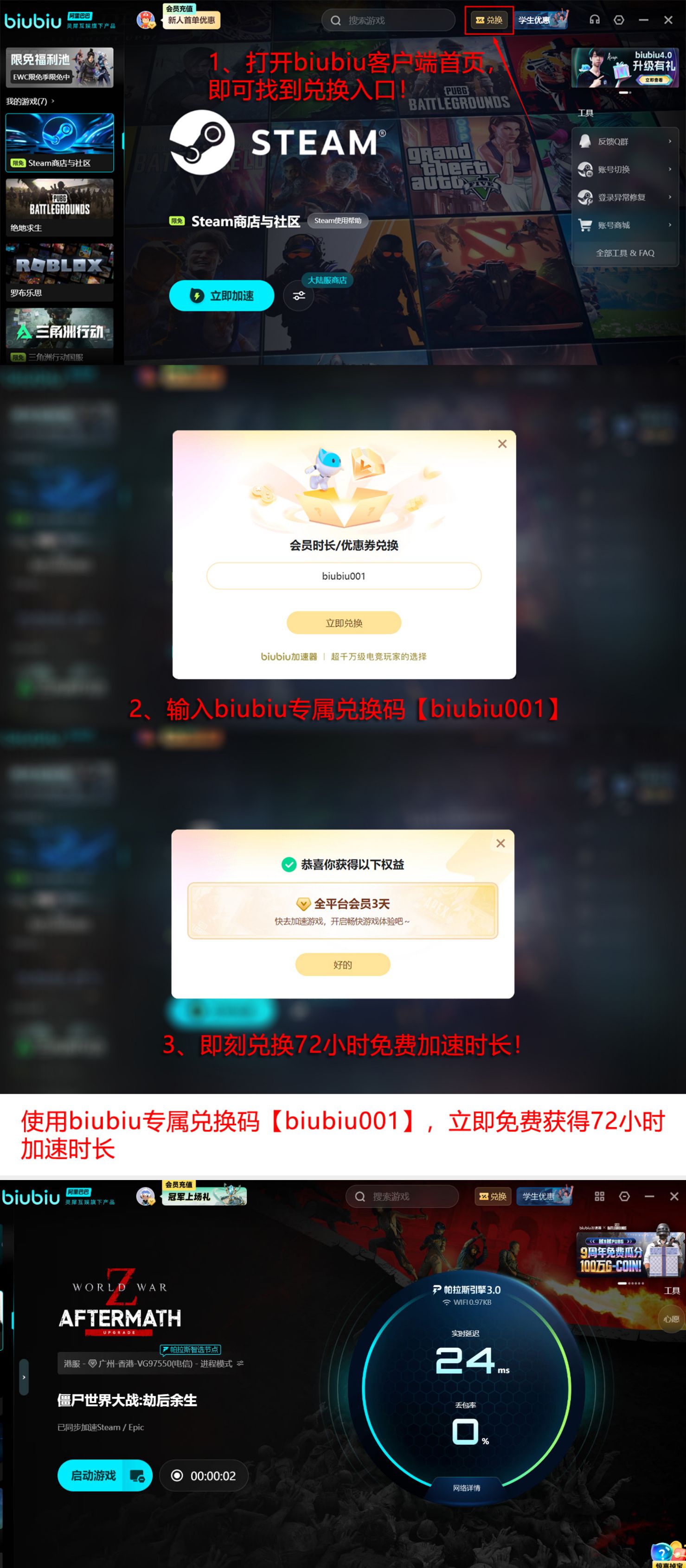 目前官方开放限时福利:所有用户均可凭通用兑换码biubiu001领取3天免费加速时长;新用户完成首次注册后,额外获赠24小时专属时长。两项权益叠加使用,最高可享96小时零成本加速服务,全程无需付费即可畅玩《僵尸世界大战:劫后余生》,告别卡顿、延迟与突发闪退。