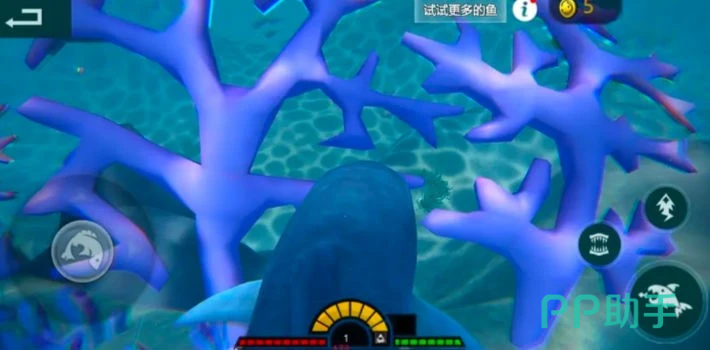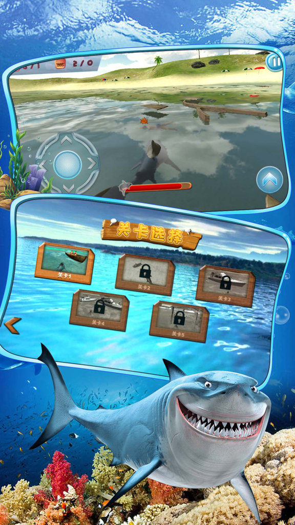 以动态进化系统为核心玩法,鲨鱼个体可通过进食小型鱼类、海龟等目标恢复生命值并触发阶段性进化。操作采用触控拖拽+重力感应双模控制,实现灵活转向与精准追击,高度还原海洋生物游弋特性。