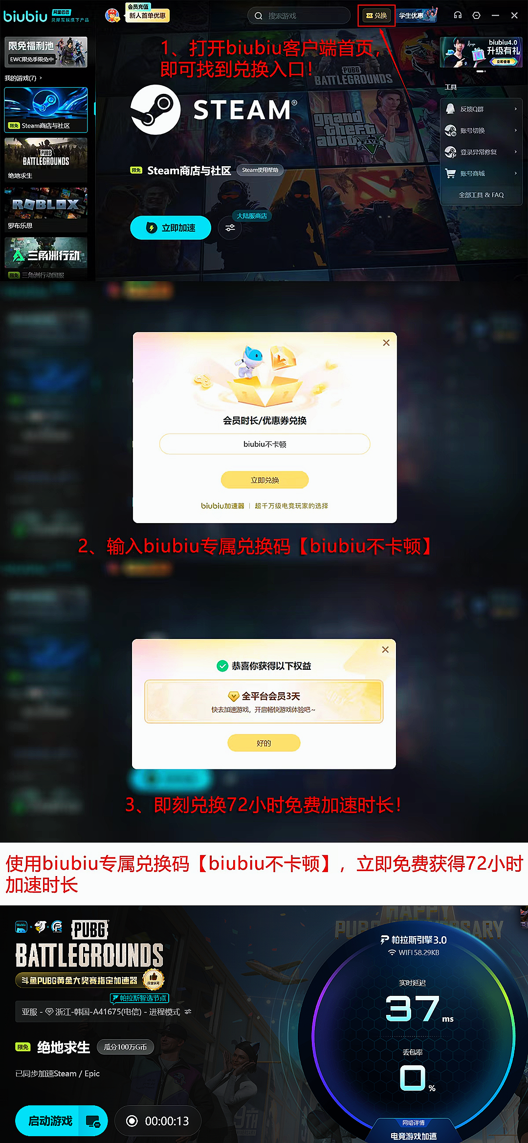 为降低新用户使用门槛,平台现开放限时福利:完成实名注册后,即可激活24小时全游戏加速权限;所有用户输入通用兑换码【biubiu不卡顿】,均可额外获得3天加速时长。新用户叠加两项权益,总计可享96小时免费服务。