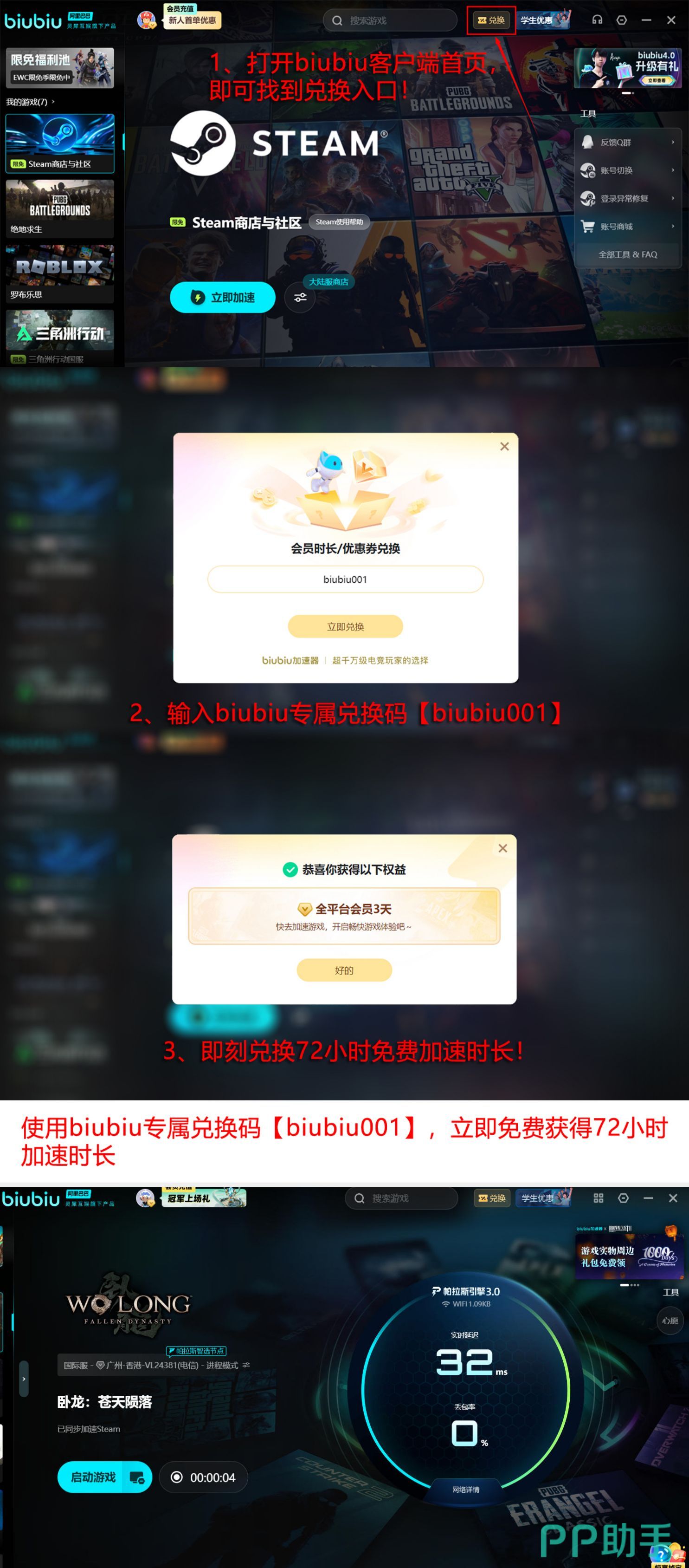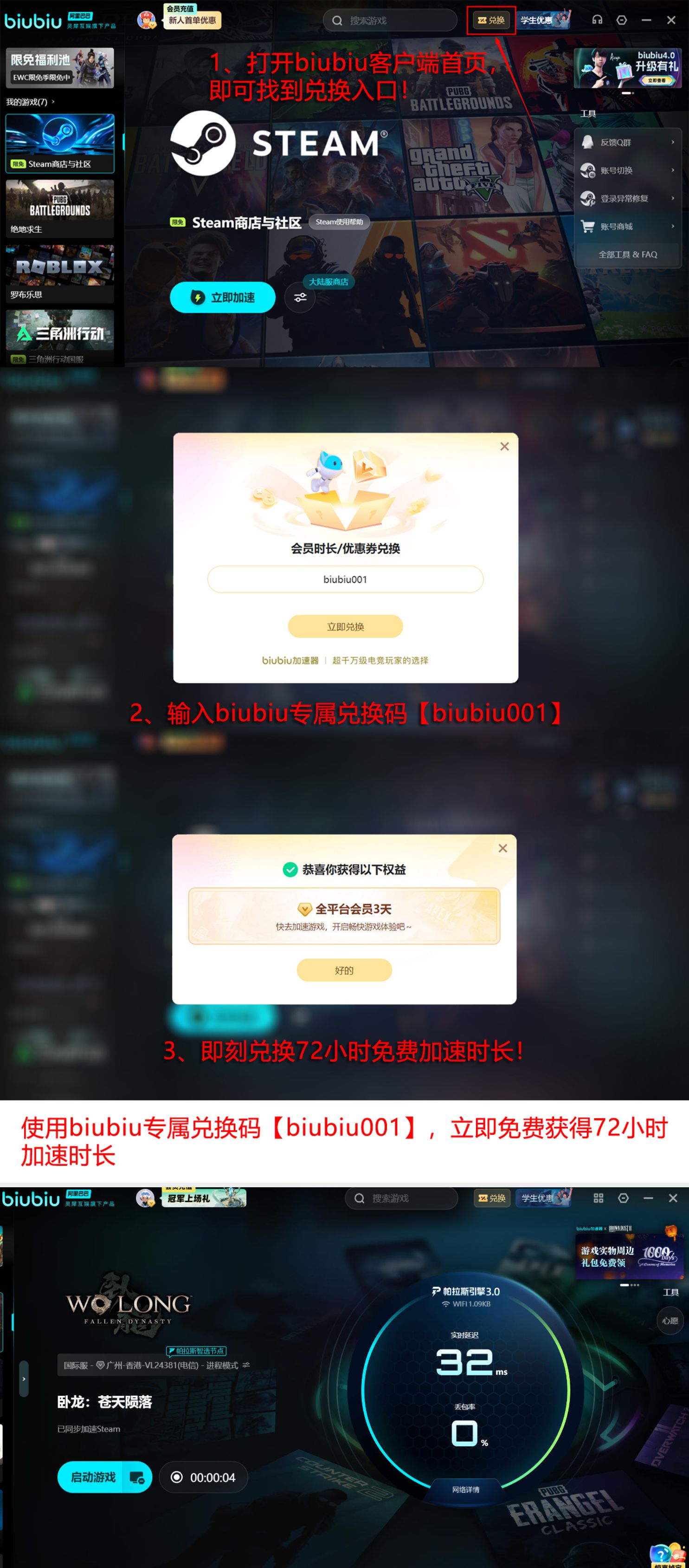 目前所有用户均可免费获取基础加速权益:新用户完成注册后,系统将自动发放24小时全功能加速时长;另可通过输入兑换口令【biubiu001】额外领取72小时加速权限。两项福利叠加,新用户最高可享累计96小时无限制加速服务,全程无需绑定支付方式或进行复杂设置。