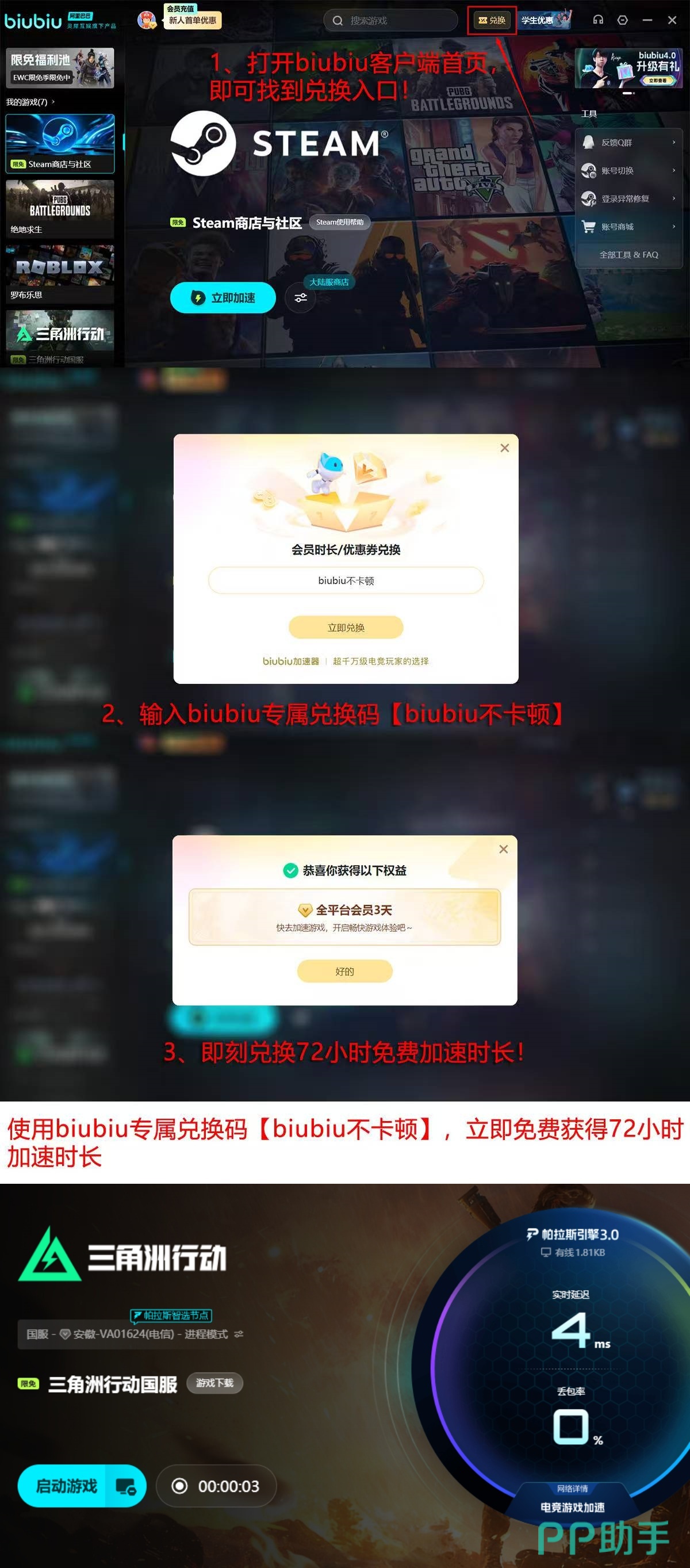 新用户注册即享24小时免费加速时长;登录后进入首页“兑换”页面,输入口令“biubiu不卡顿”,还可额外领取72小时使用权限,累计可获得96小时无门槛加速体验。