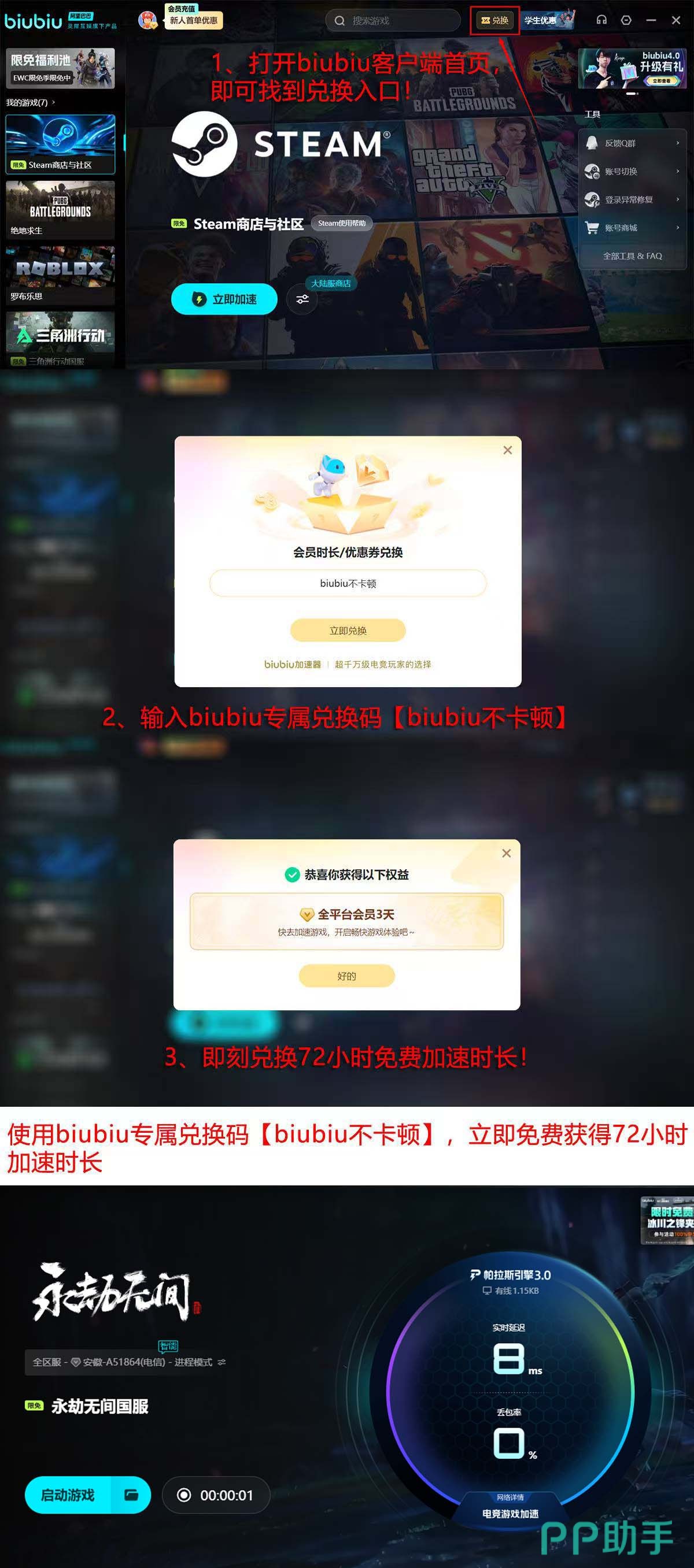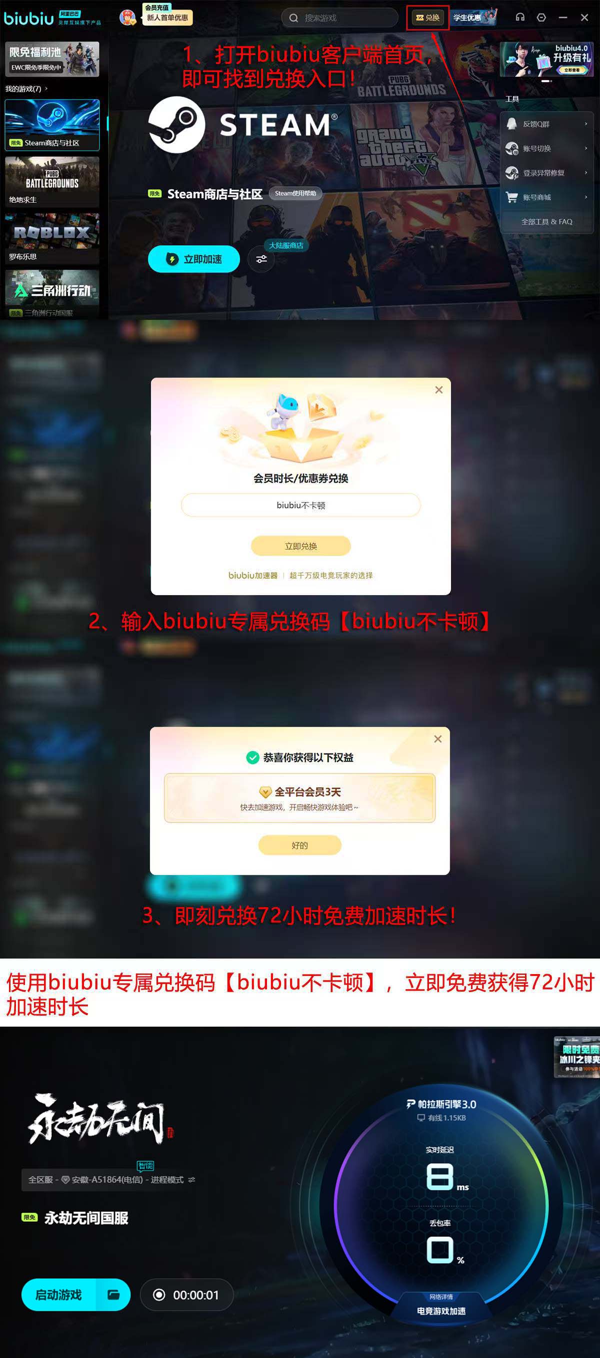 升级后的biubiu加速器在《永劫无间》国服场景下实测显示:平均连接成功率提升至99.97%,战斗中帧同步误差下降42%,走位指令延迟压缩至12ms以内。新用户注册后即可获赠24小时免费加速时长;老用户及新用户均可凭兑换码【biubiu不卡顿】在首页领取额外72小时服务,累计最高可达96小时体验权益。