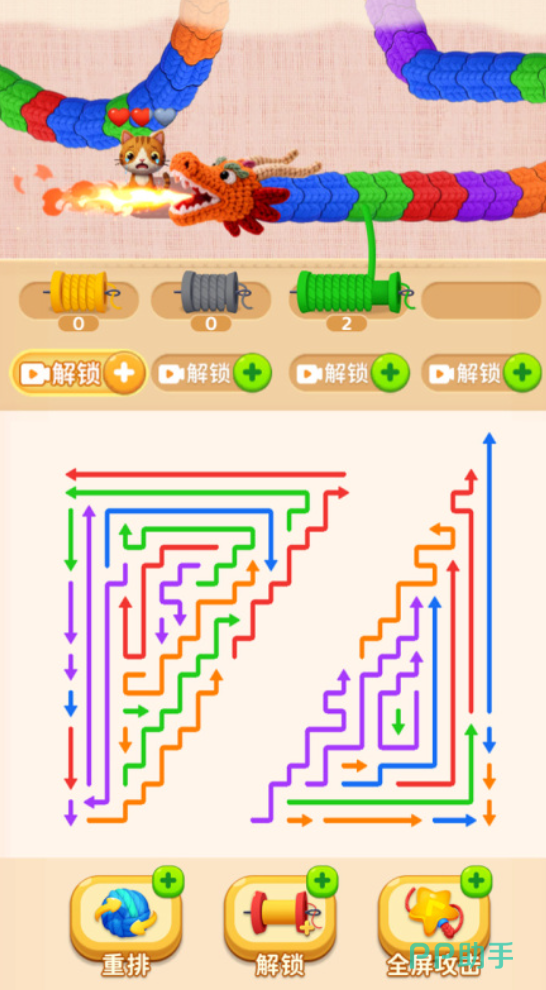 在表现层面,《箭头超解压》采用高饱和度色彩体系构建箭头蛇阵,滑动过程具备丝滑物理反馈;背景中巨龙推进节奏与猫咪声效形成张力十足的听觉线索,强化临场紧迫感。每次弹药发射均同步激活光效粒子与低频震动反馈,配合阶梯式递增的关卡难度设计,既保障入门友好性,又持续提供成长型挑战体验。