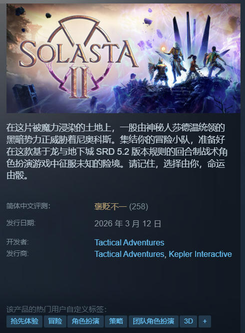 《索拉斯塔2:暗影之冠》(Solasta 2)是一款备受期待的战术角色扮演游戏,由独立工作室Tactical Adventures倾力打造。作为前作《索拉斯塔:破晓之地》的正统续作,本作延续了深度D&D 5e规则体系,并依托Unreal Engine 5引擎实现画面表现与系统交互的全面升级,在全球RPG玩家群体中持续引发高度关注。