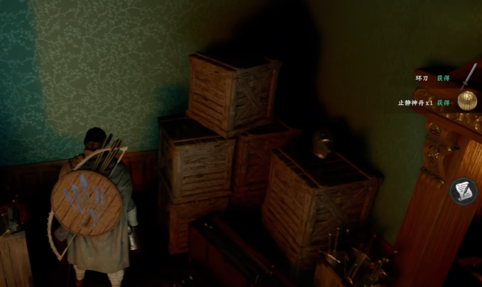 向左微调视角,可见副宅建筑。绕开门前巡逻守卫,从二楼窗户翻入。右手侧房间门可用钥匙开启,地面宝箱内存放环刀道具。