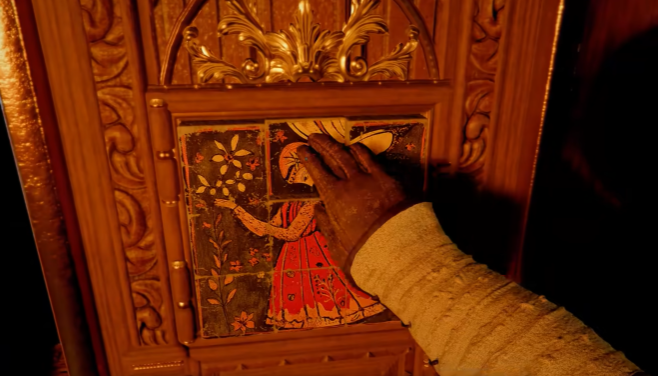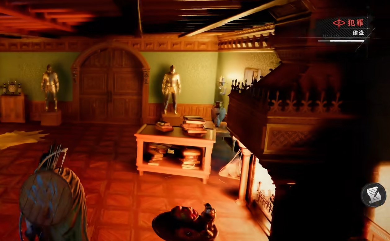 返回楼下客厅,进入左手边首个房间,开启宝箱获取黄铜守卫板金手套。接着靠近壁炉处篝火,长按注视交互,触发偷窃选项,成功获取一根金条。再次等待犯罪值归零后,登上二楼,推开楼梯口窗户跃出。