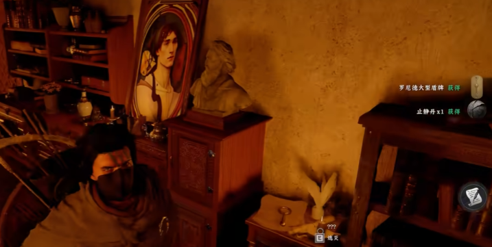 注意:此时犯罪值已接近满格。需原地等待数值自然回落至安全阈值以下,避免触发警戒机制导致通缉状态。待进度条清空后,穿过对面圆形拱门,沿走廊直行至尽头储藏室,用钥匙开启房门,宝箱内可获得罗尼德大型盾牌。