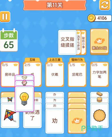 核心机制围绕“卡片归类”展开:每局随机生成若干张内容各异的卡牌,涵盖词语、符号、概念等多元信息。玩家需依据内在逻辑关系(如词性、领域归属、抽象层级等)完成分组,全部正确归位即视为通关。