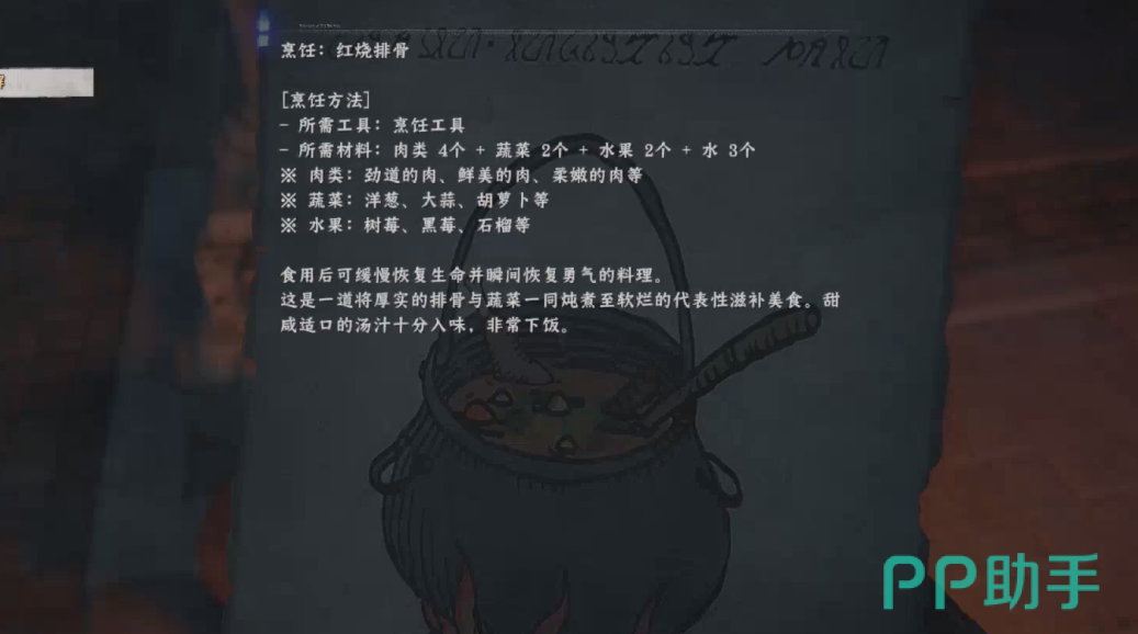 进阶烤制菜式“红烧排骨”需前往埃尔南德城宴会厅获取食谱,进入该区域须穿戴礼服。其标准配比为:4份肉类 + 2份蔬菜 + 2份水果 + 3份水。成品具备持续生命恢复效果,并可在食用瞬间完全填充勇气值槽。