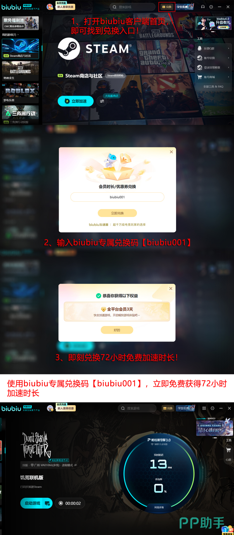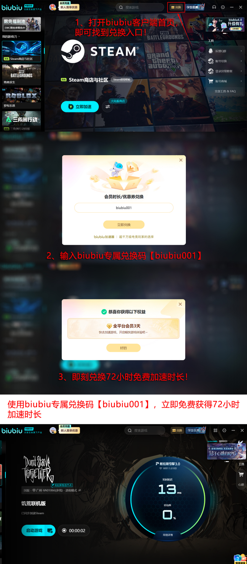 目前平台面向新用户开放双重福利:完成注册后系统自动发放24小时免费加速时长;另可使用专属兑换码【biubiu001】额外领取3天加速权限。两项叠加后,总计可享96小时无限制加速服务。无论是独自深入永冬洞穴、重建木制基地,还是反复调试机械农场,全程均可保持低延迟、零中断的流畅体验。