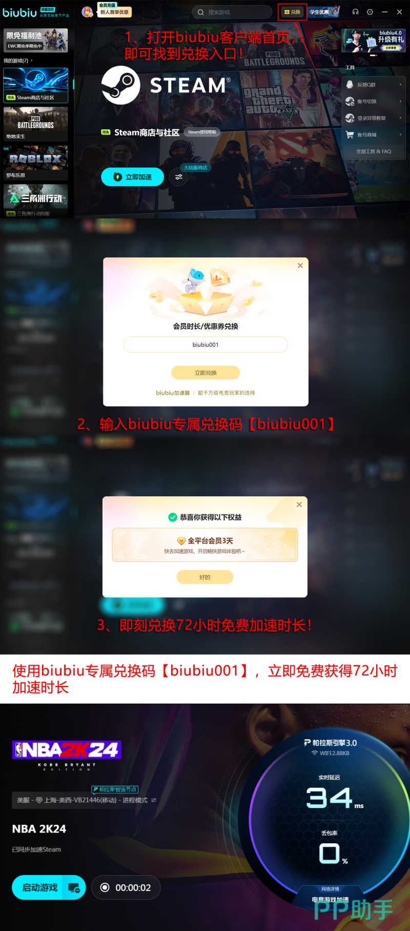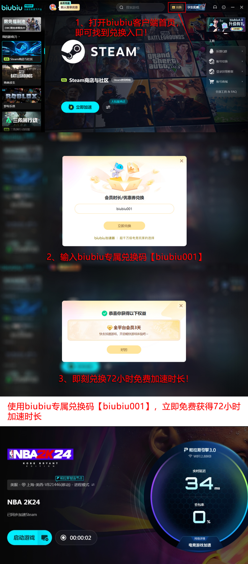 当前平台开放限时福利通道:所有注册用户均可申领免费加速时长。新用户完成首次登录后,自动获得24小时基础加速权益;叠加专属兑换码【biubiu001】,还可额外领取3天连续加速权限。两项叠加总计可达96小时免费使用周期,相当于完整覆盖四整天高强度游戏需求,无需额外付费即可畅玩《NBA 2K24》全内容。