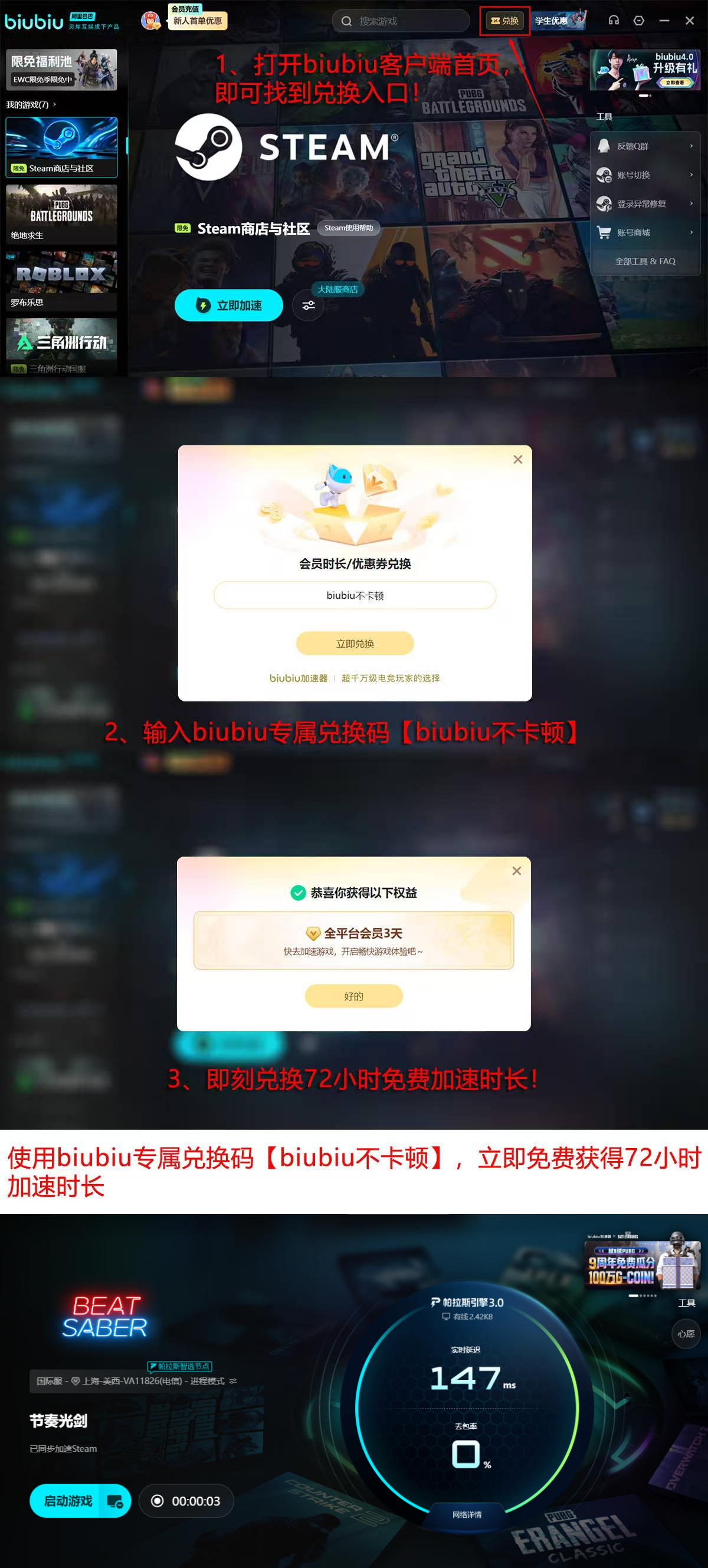 为助力玩家零成本解决体验障碍,biubiu加速器面向新注册用户开放专项体验权益:完成首次账号注册即可获赠24小时全功能免费加速时长;再输入专属兑换码【biubiu不卡顿】,额外激活72小时加速权限。两项福利叠加,总计可享96小时无限制、不限速、全覆盖的《节奏光剑》专用加速服务,涵盖启动验证、云存档同步、联机对战等全部网络交互环节。