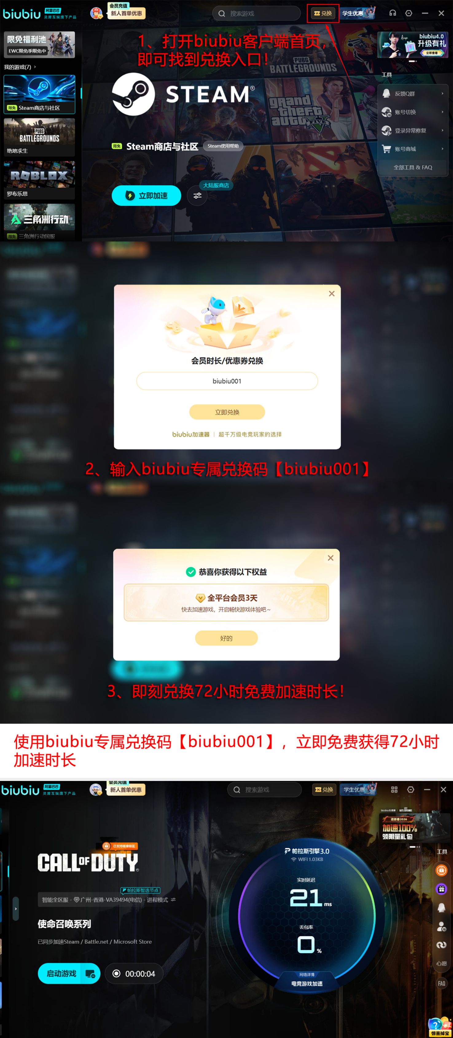 当前平台开放多项新手激励政策:首次注册用户可立即领取24小时免费加速时长;输入通用兑换码【biubiu001】还可额外获得3天使用权,新老账户均可参与。两者叠加后,新用户总计可享96小时无费用加速服务,无需投入硬件升级成本,即可实现低延迟、高稳定的游戏连接体验。
