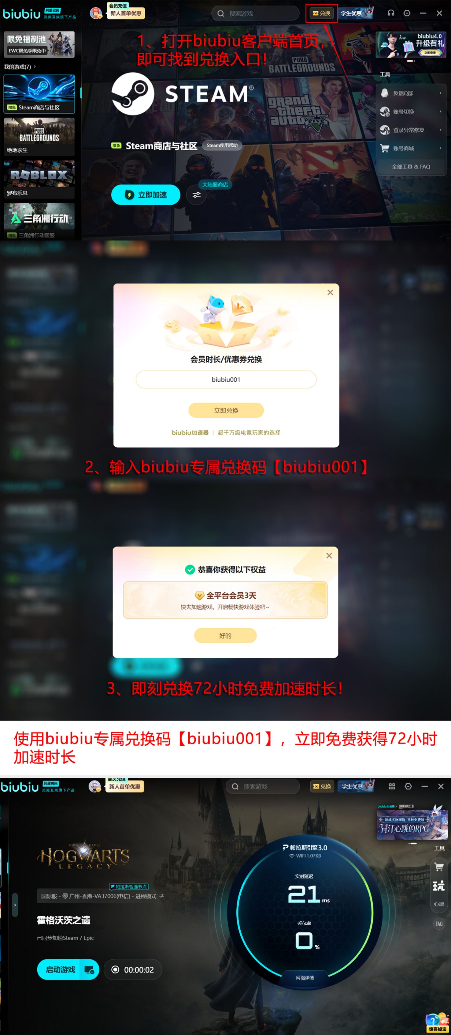 目前平台开放三项限时免费权益:第一,所有用户(含新老)输入兑换码【biubiu001】,即可领取3天加速服务;第二,首次注册用户登录后自动发放新手礼包,享24小时免付费加速;第三,新用户可叠加使用兑换码与首登礼包,最高累计获取96小时连续加速时长。全程零费用,无需额外订阅,配合前述本地设置调优,即可实现流畅稳定的魔法世界探索体验。