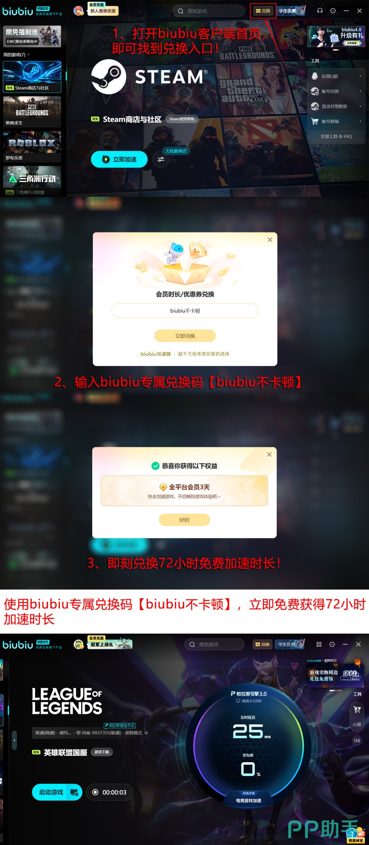 为降低用户尝试门槛,biubiu加速器当前开放新人专属权益:完成注册即可领取24小时全游戏免费VIP权限。此外,官方同步推出限时通用兑换活动——所有用户打开biubiu客户端,在“兑换中心”页面输入激活码【biubiu不卡顿】,即可即时获得72小时加速服务时长,无设备绑定限制,支持多平台账号通用。