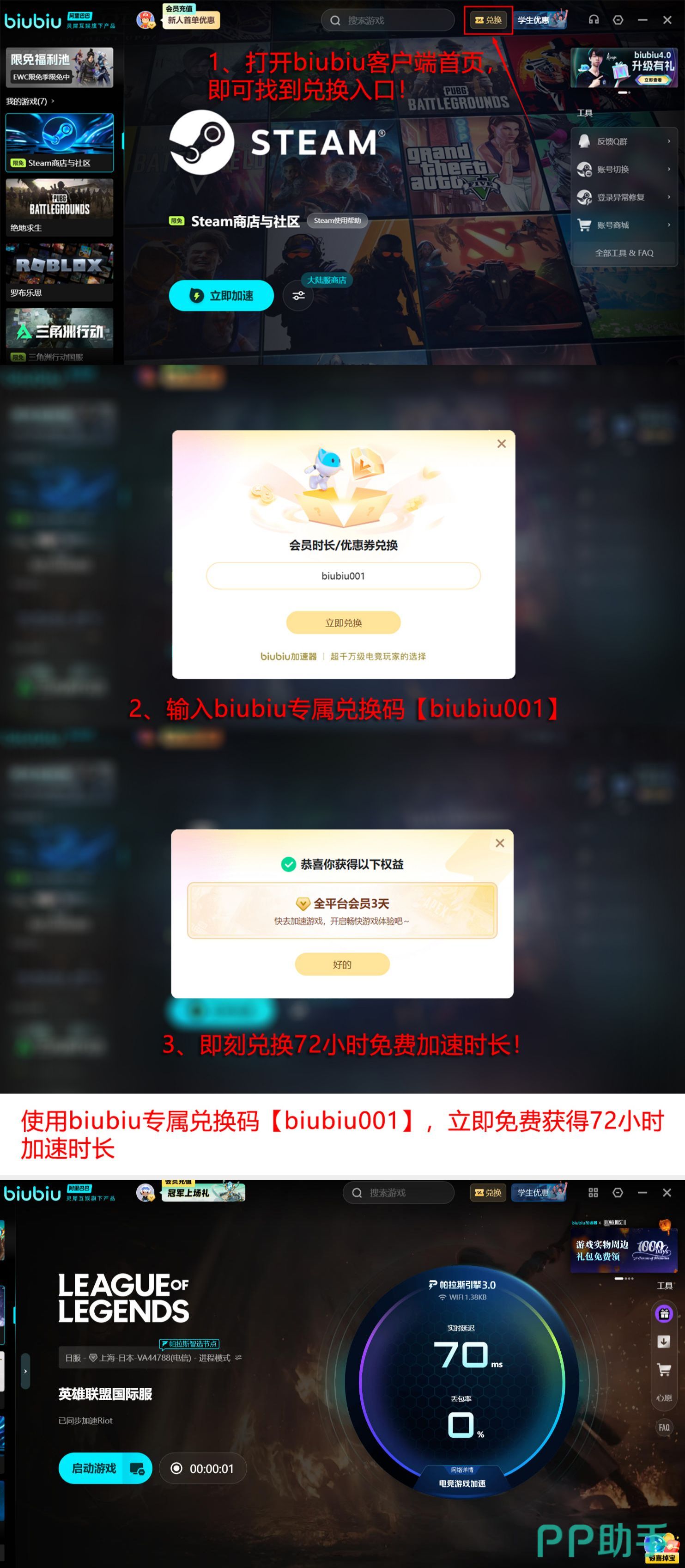 当前新用户注册即可获赠24小时免费加速时长;另可凭兑换码【biubiu001】额外领取3天免费使用权。两项福利叠加后,总计可享96小时无限制加速服务,充分覆盖多场排位赛周期,保障欧服对战全程流畅稳定。