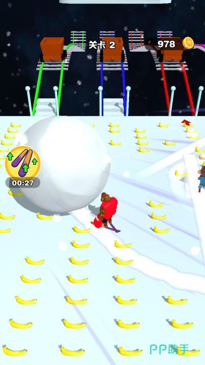 作为系列中首款全3D视角作品,其核心创新在于“吸附式成长系统”:雪球自动吸附路径上散落的雪粒、冰晶与补给包,无需手动拾取即可持续扩容。画面全程呈现粒子拖尾与动态轨迹线,强化操作可视化。对抗模块拓展投掷机制——玩家可将雪球短暂托举后抛出,触发弧线飞行与二次弹跳;亦支持双人接力模式,前一人推送至指定区域后,由队友接续滚动,考验协同默契。