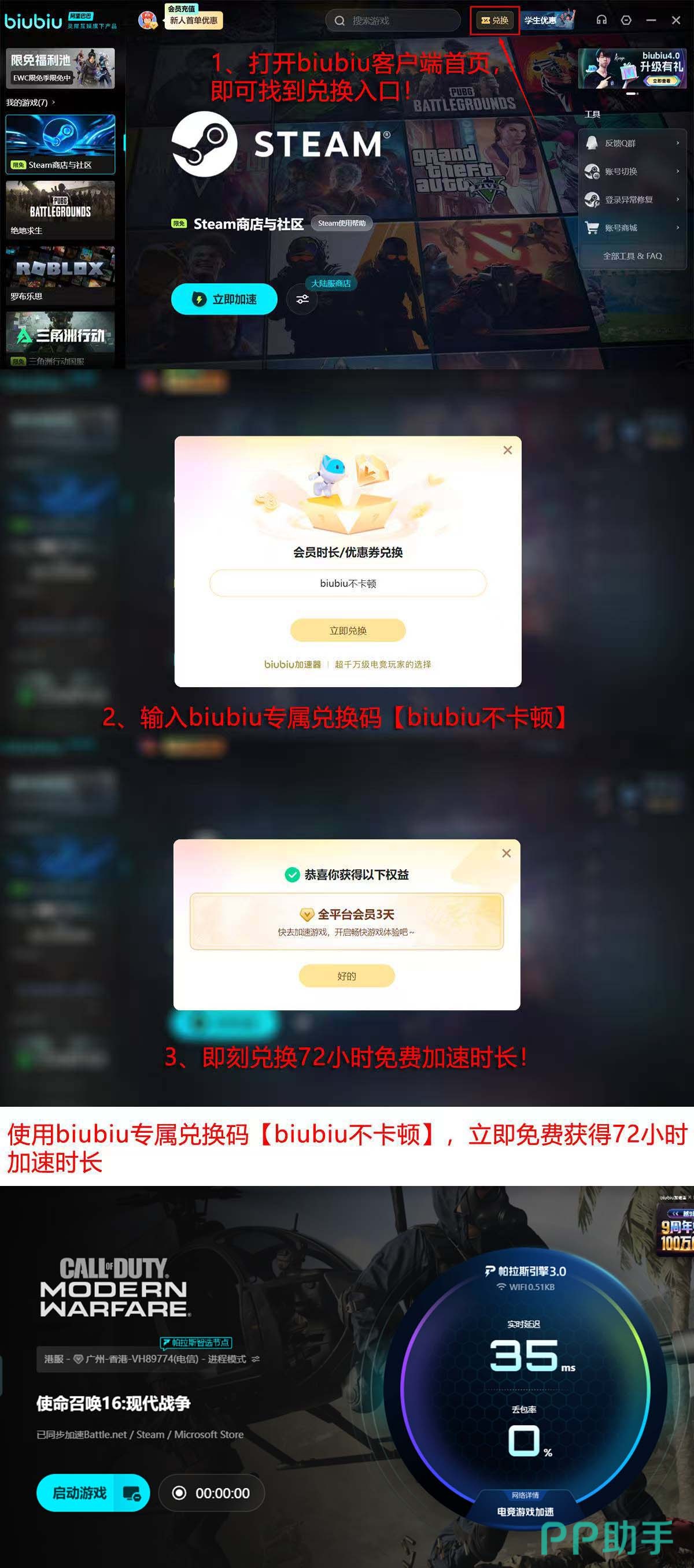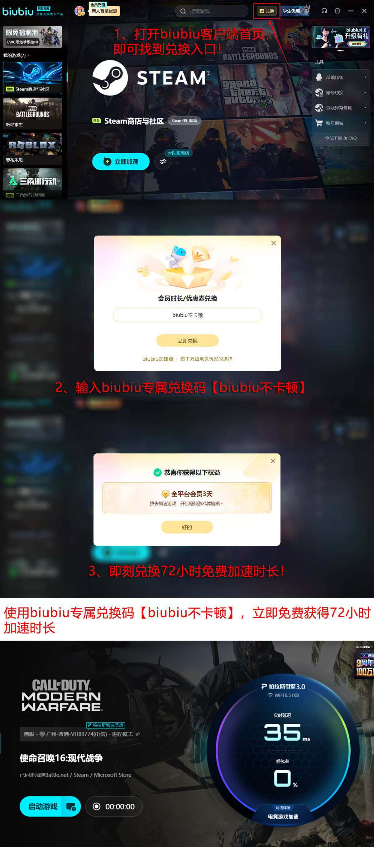 对于希望提升《使命召唤16》联机稳定性的玩家,建议优先尝试biubiu加速器。新用户注册即可获赠24小时免费加速时长,自动发放至账户;另可通过首页“兑换”入口,输入专属口令【biubiu不卡顿】领取72小时额外时长,两项叠加共计96小时全功能体验权限。