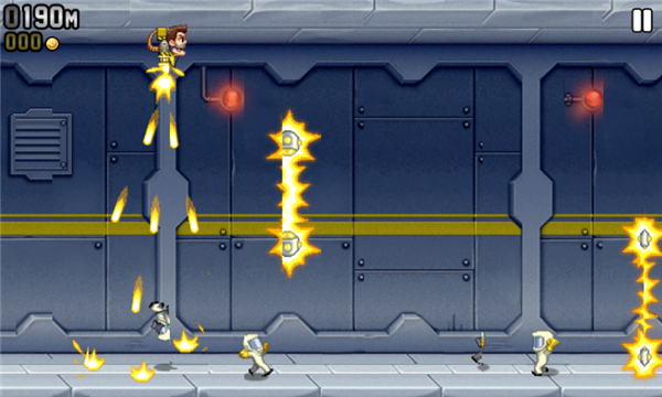 采用高速响应型横版卷轴结构,整合跑酷位移、空中滞留、武器模块化装配三大核心机制。主角装备可升级喷气背包,支持多段垂直机动与紧急闪避;关卡中嵌入电锯陷阱、自适应追踪导弹、环境崩塌等复合型障碍,考验玩家操作精度与战术预判能力。