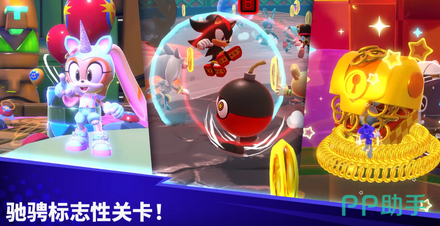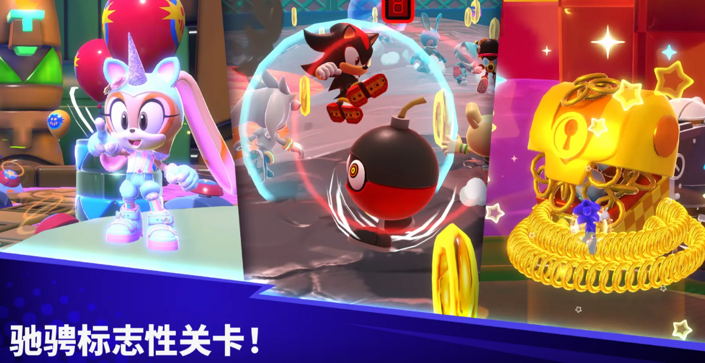 本作采用高饱和度的色彩设计,画面鲜艳活泼,玩家可以扮演索尼克系列中的经典角色,比方说纳克鲁斯、艾咪、索尼克等,在众多的场景中开始冒险,从色彩丰富的玩具工厂到错综复杂的机关地带,每个场景都充满了探索的乐趣。